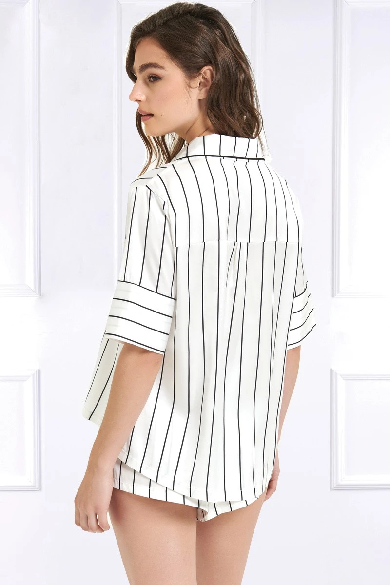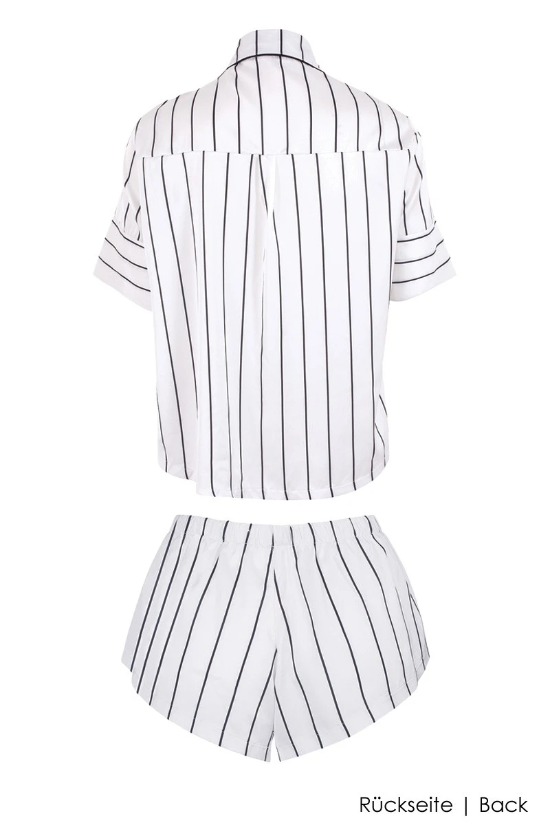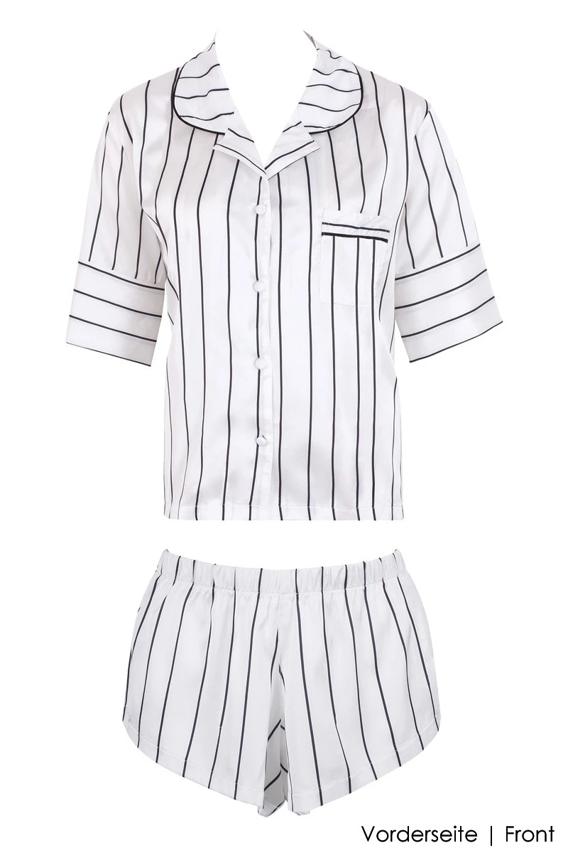 Slip into the Alma Satin Pajama Set and embrace the relaxed cut and feel of this gorgeous piece of nightwear. The shiny white satin with blue stripes is inspired by the classic pyjama while featuring a sexy Bluebella twist. The alluring design of the shiny shorts and short sleeved top will look amazing on you. Elegant details like satin covered buttons, a piped collar and applied breast pocket are adding to the timeless beauty of this short satin pyjama set.