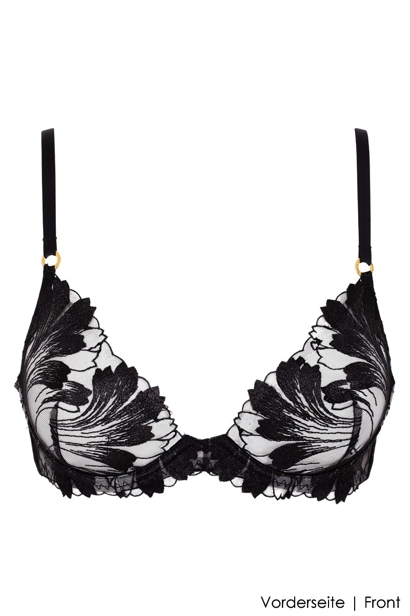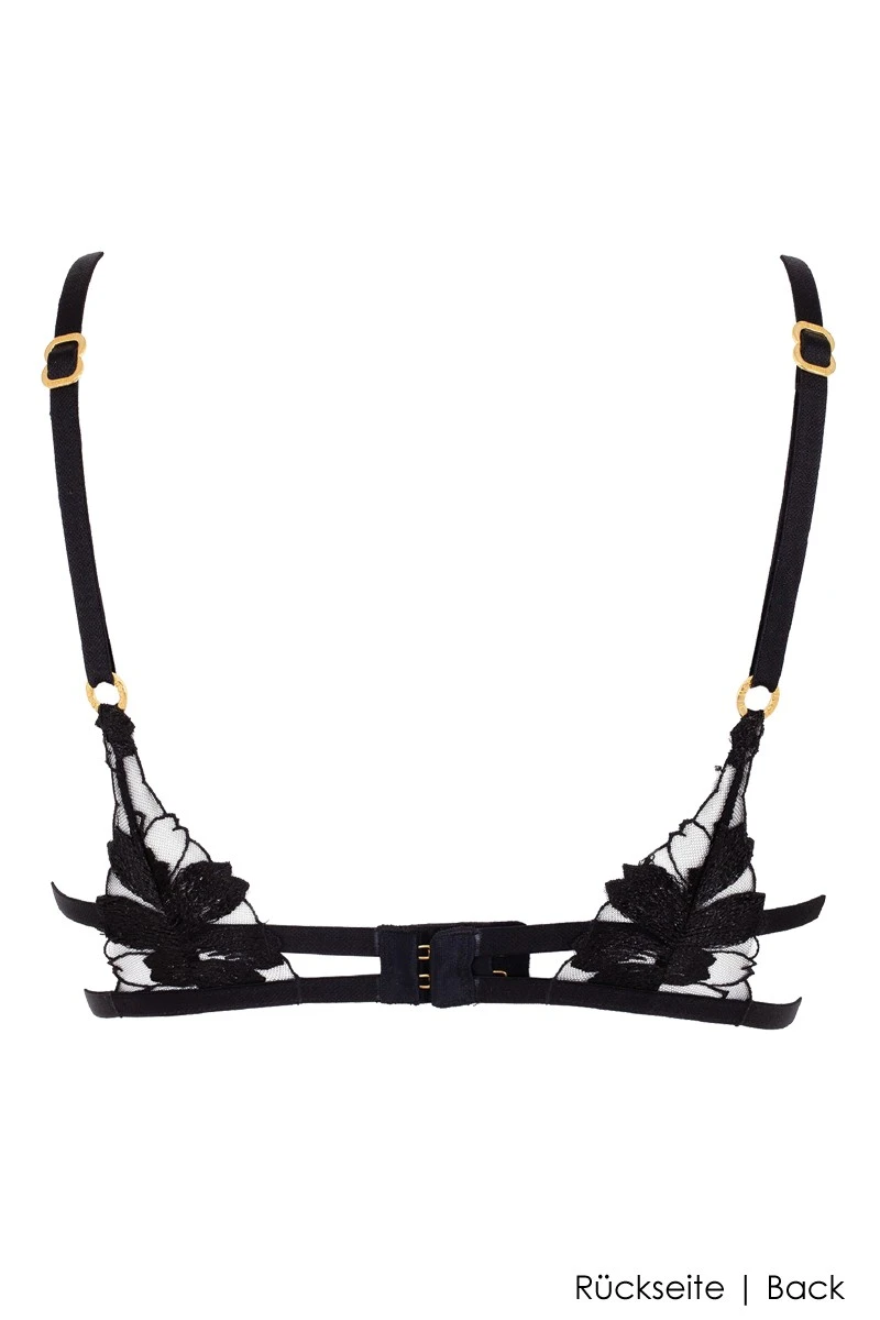 You prefer the comfort and style of an unpadded wired bra? Then the Colette Bra is just perfect for you. Made of florally embroidered tulle you will enjoy an airy feel and a fantastic lightness. Mix and match it with the Colette Brazilian Brief, Thong and Body Harness for various styling options that will make your life much richer and more exciting.