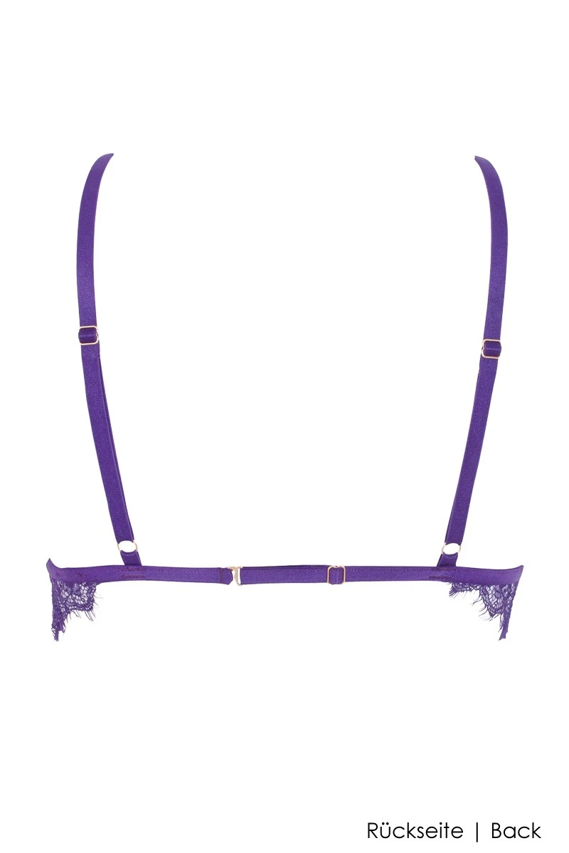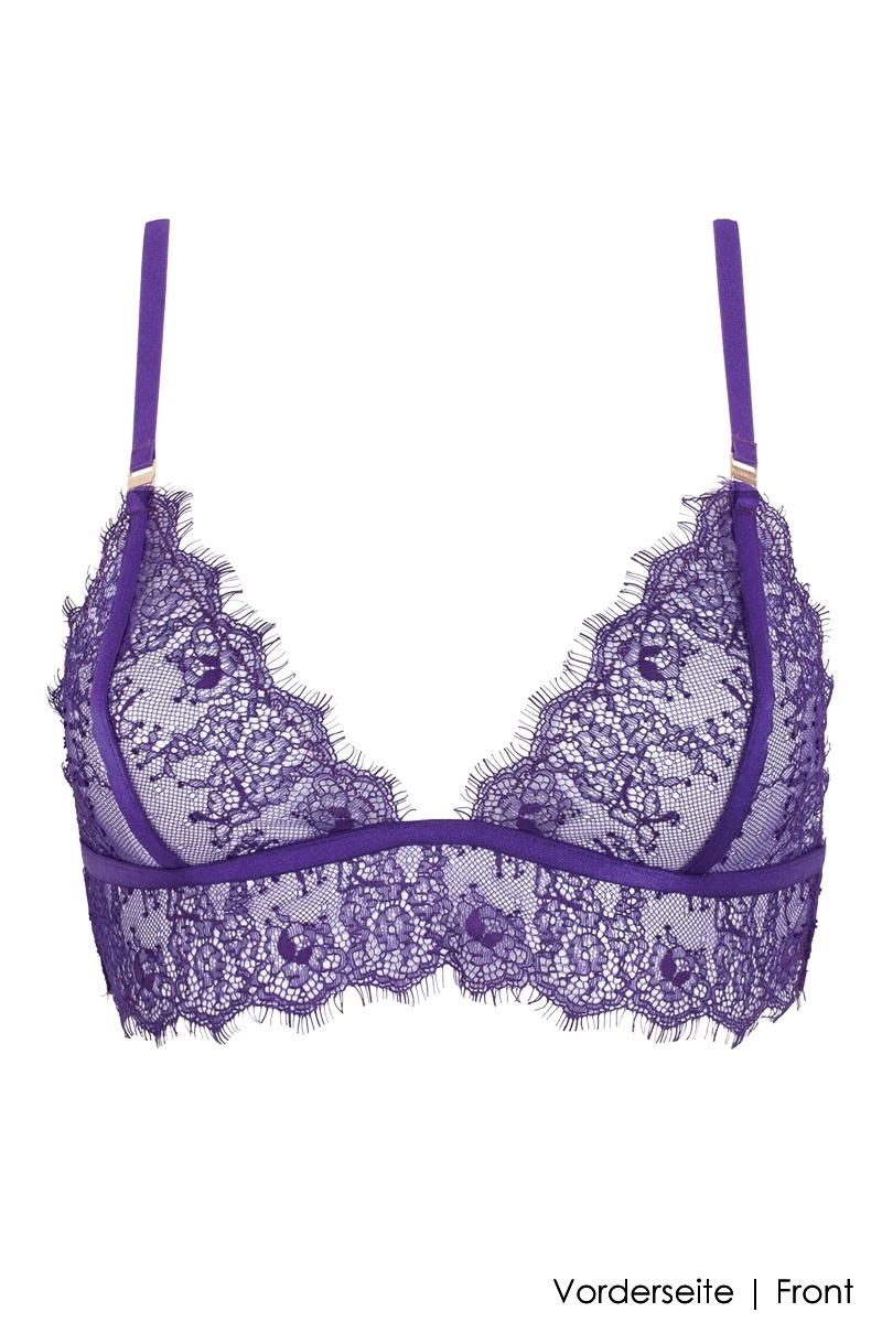 Made of embroidered tulle featuring decorative „Eyelash“ edges, we love the beauty and versatile nature of this wireless triangle soft bra. Just imagine how this stunning design will enhance and add to your fashion looks! Light and airy, the bustier style cut is a joy to look at as it creates a beautiful and natural decolleté. For the most dazzling lingerie experience for you and your partner, the matching Brazilian Brief and Thong in „Heliotrope Purple“ is waiting for you in the „Complete the Look“ slider right above.
