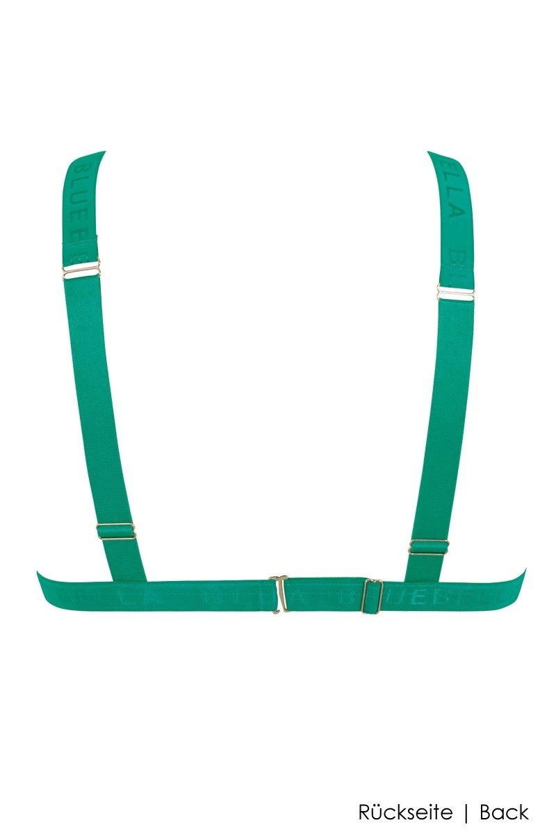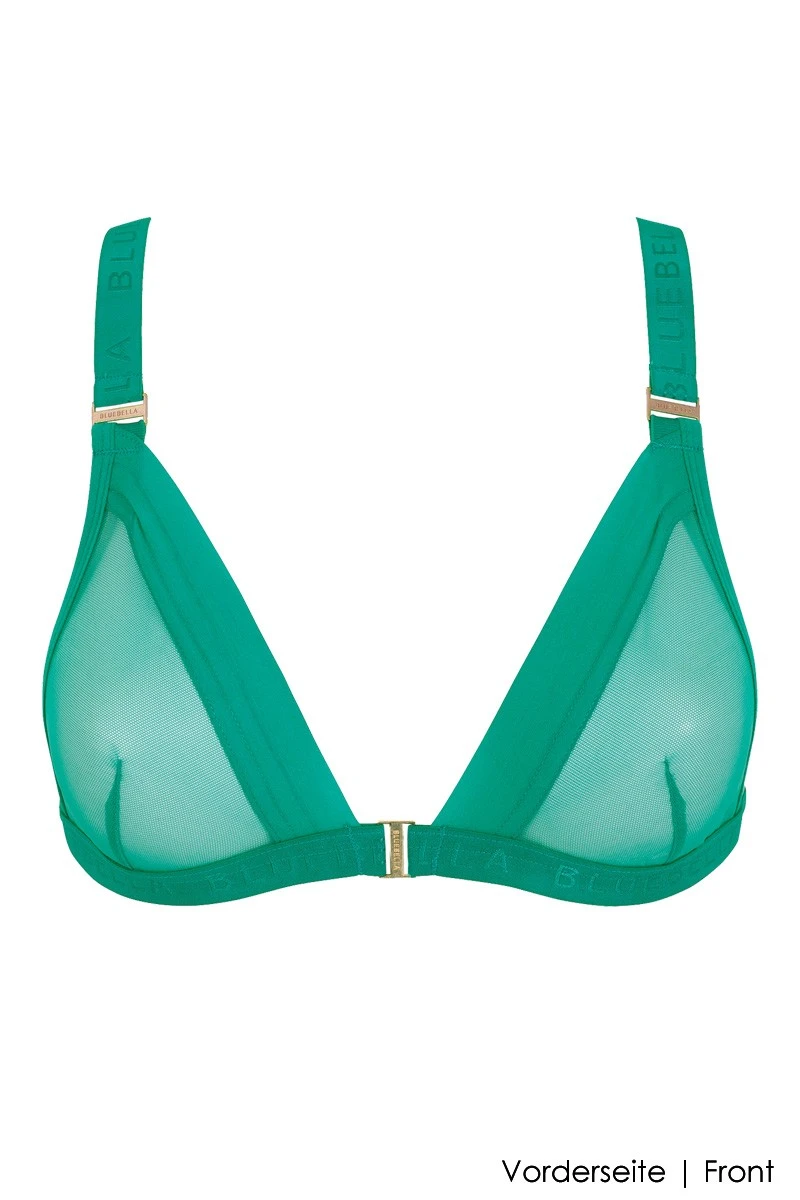 Matching to the Lilia Brazilian Brief, you should wear this sporty yet glamorous Soft Mesh Triangel Bra. The wireless bra is made of semi-transparent tulle in a brilliant „Columbia Green“ colour and is just perfect for an active lifestyle. The shiny golden hardware details connect the elastic straps that feature woven in logo writings. The elastic shoulderstraps as well as the underbreast band are wide, providing a superb wearing comfort.