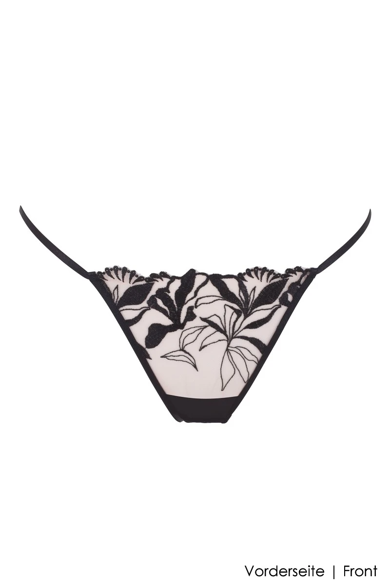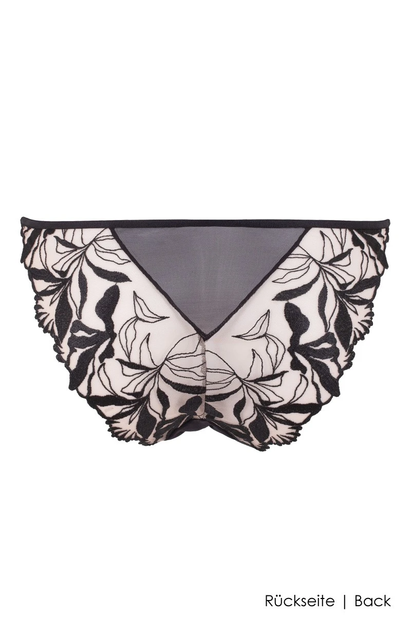 - Light and sexy Brief made of nude colored tulle with black, floral embroideries