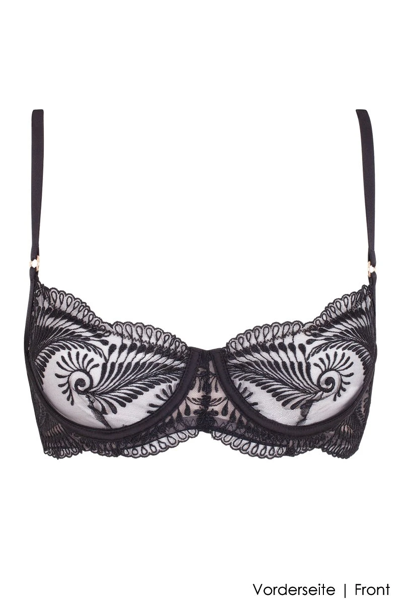 The one of a kind Rafaela Balcony Bra is featuring unpadded cups made of florally embroidered see-through mesh in combination with shiny golden hardware details. The integrated wires are shaping a naturally beautiful decolleté while offering a superb level of wearing comfort. Embrace the modular concept of the Rafaela Line and treat yourself to the matching thong, brazilian brief and thigh harness for a maximum of range. This way you can use the bra as an eye catching fashion piece as well as alluring erotic lingerie that is going to blow your partners mind.
