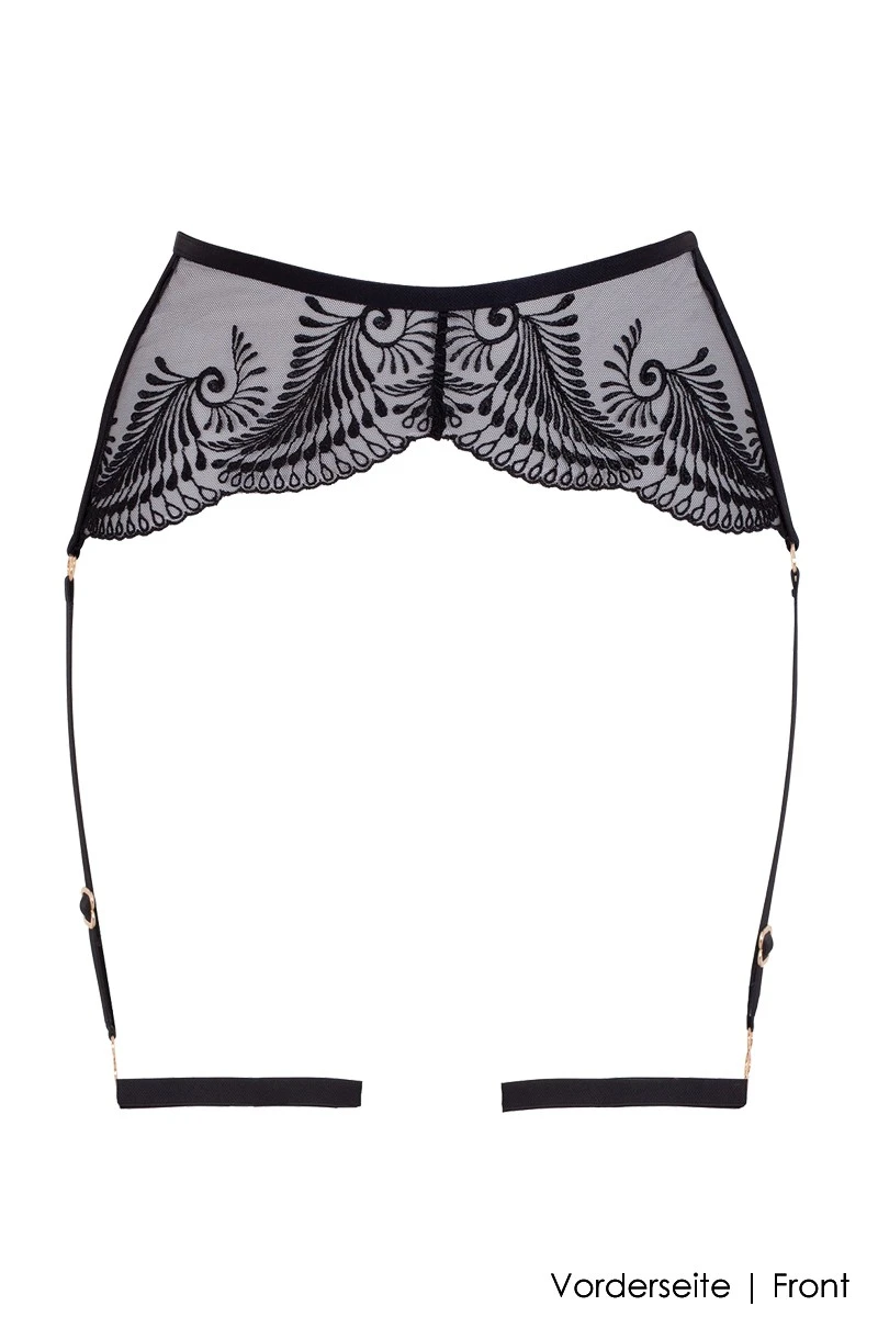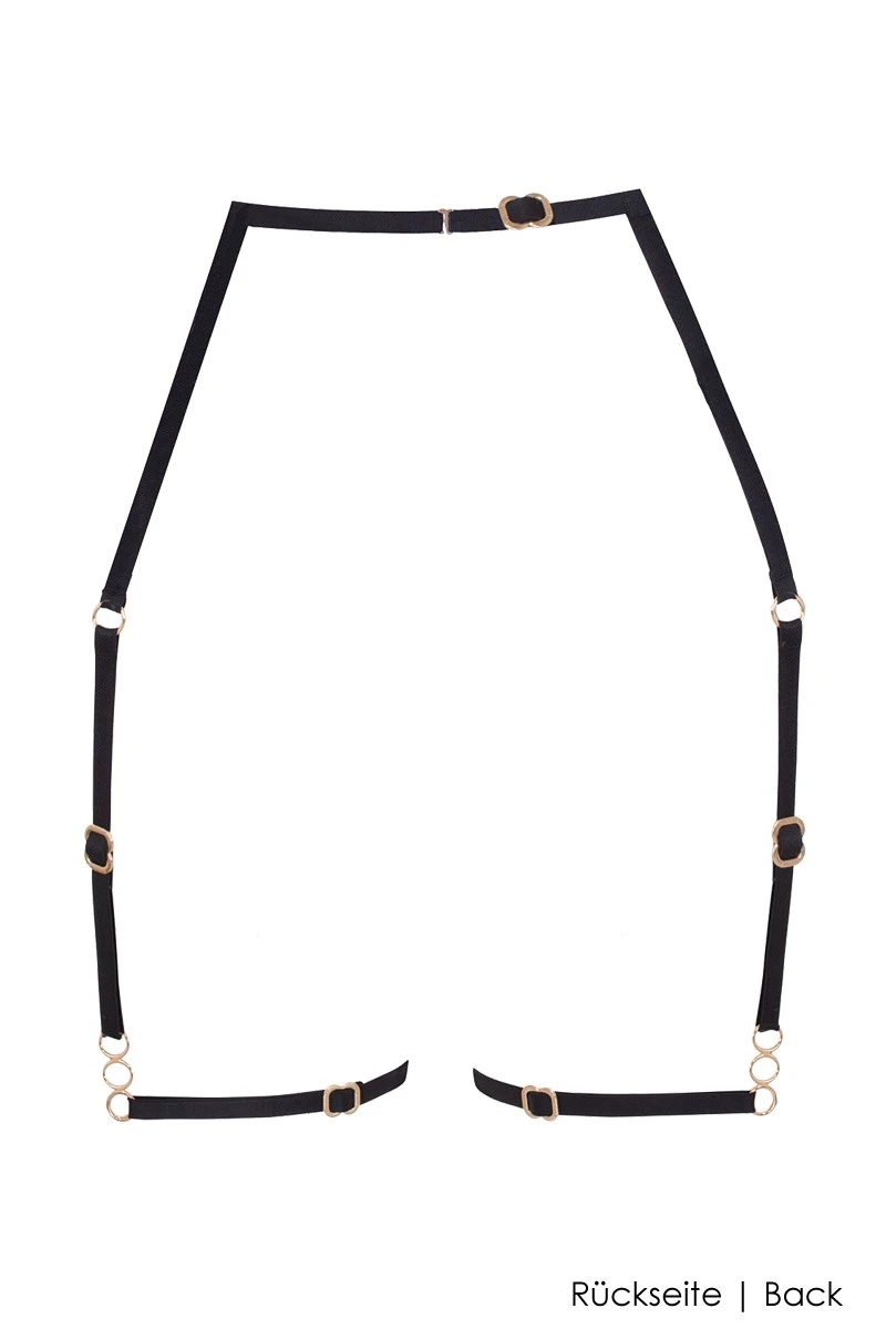 Make gorgeous lingerie even more special and crown your Rafaela bra and thong with this unique and sexy thigh harness. This modern style is combining the allure of a body harness with the dazzling look of a suspender belt. Floral embroideries on see-through mesh with shiny golden hardware details are adding to the glamorous look that will enchant you and your partner.