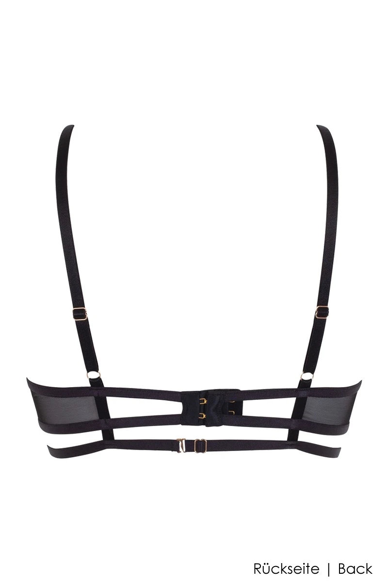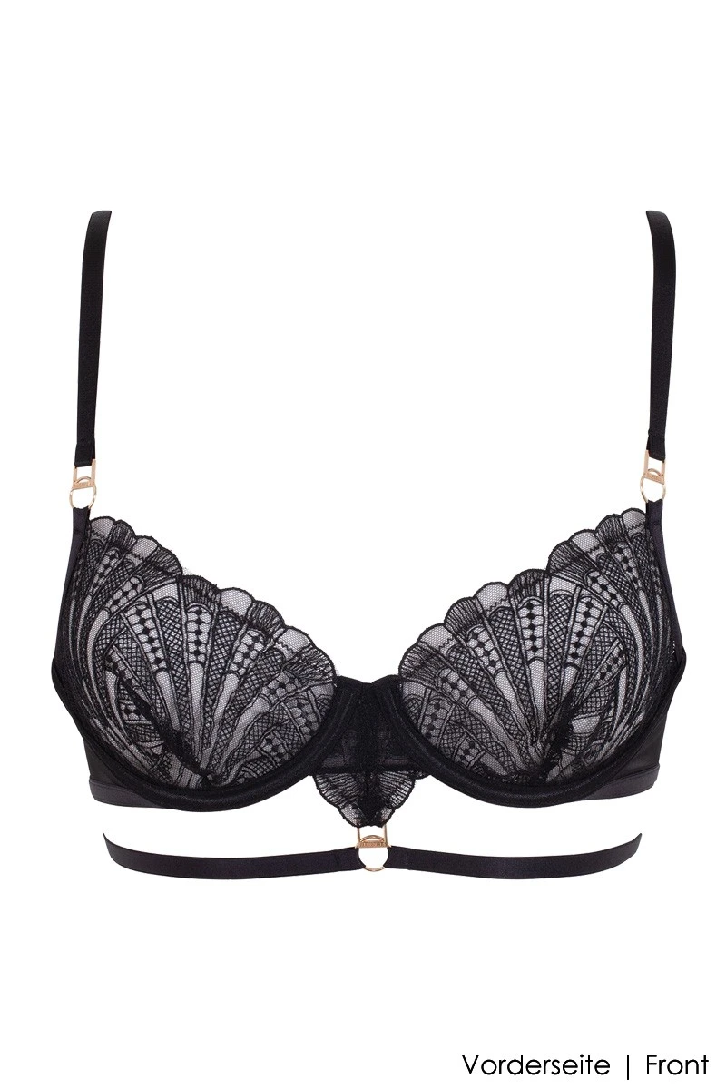 You love the elegance of Art Deco? Then we have the perfect lingerie just for you. Most beautiful in combination with the matching Thong (sold separately), the Hallie Wired Bra is an eye-catching piece that proudly represents this famous era of decorative design. The lovely embroideries on black tulle had been beautifully contrasted with golden hardware details. The integrated wires and unpadded cups are creating a lovely decolleté that looks natural and perfectly shaped. Wear it undereneath a blouse, a dress or shirt and don´t be shy to let the strappy design pop out here and there. Sexy and elegant, the Hallie Bra is a versatile companion that shows your keen sense of style.