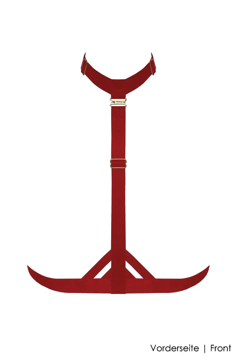 Discover the allure of this stunning hot red Art Deco Harness by Bordelle. Elastic and fully adjustable, it can be dressed on top of your blouse or serve as an eye-catching detail of your erotic lingerie look. The 24 Karat GOLD plated components are stunning to look at and create a lovely contrast to the shiny red satin bands.
