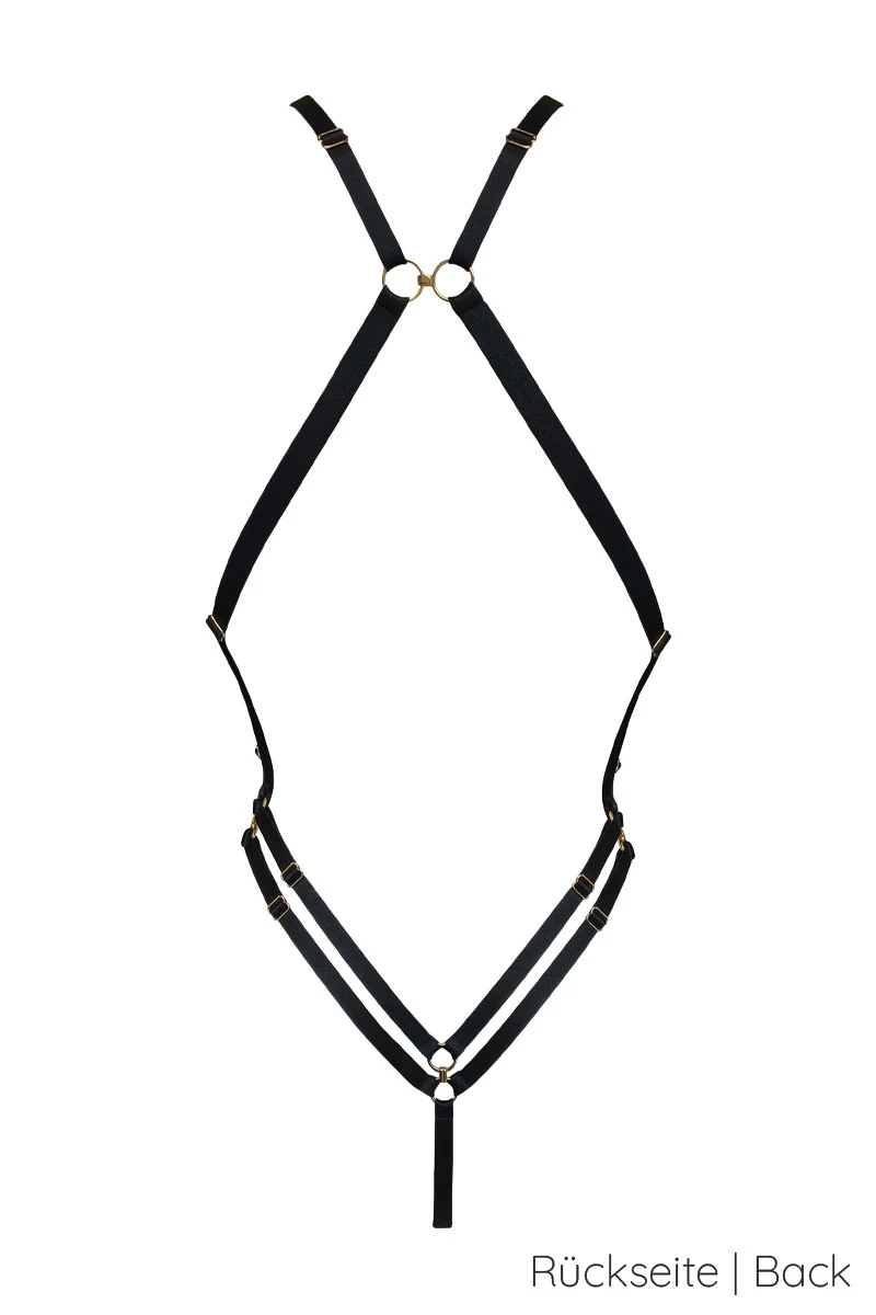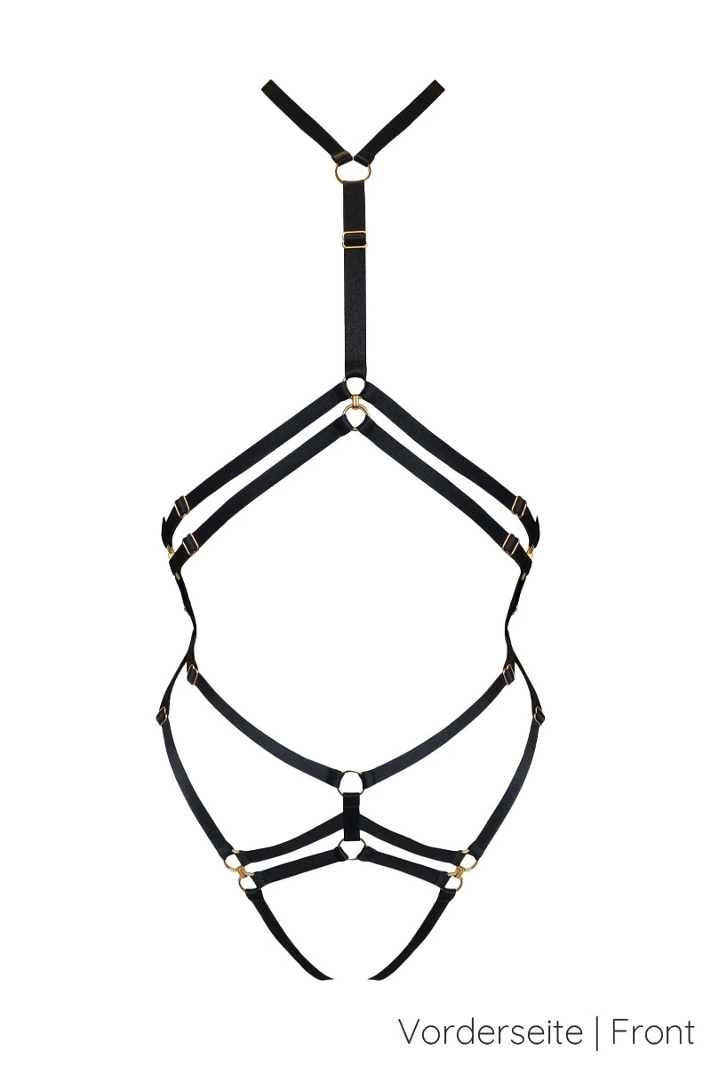 Experience the unique qualities of high end open lingerie by strapping into the Circe Bondage Body Harness. Completely open and crotchless, the strappy design is fully adjustable and fits like a glove. You can enjoy all variations of erotic play without having to take off this highly decorative design. The stretchy satin bands are inspired by the art of bondage, framing your assets in the most captivating way. 24K gold plated chain-link and other hardware details are crowning the sophisticated design. The Body Harness is also perfect to be layered on top or underneath other Bordelle Lingerie pieces (see product imagery). Make sure to add a set of our gorgeous nipple pasties and matching leg garters if you want make your partners head spin. And refining your look is much easier than you think! You can find curated matching items and daring styling ideas in our „Complete the Look“ slider above.
