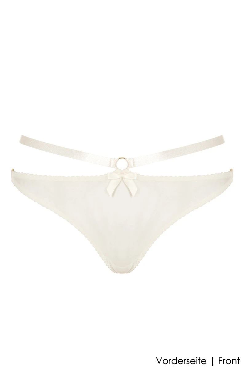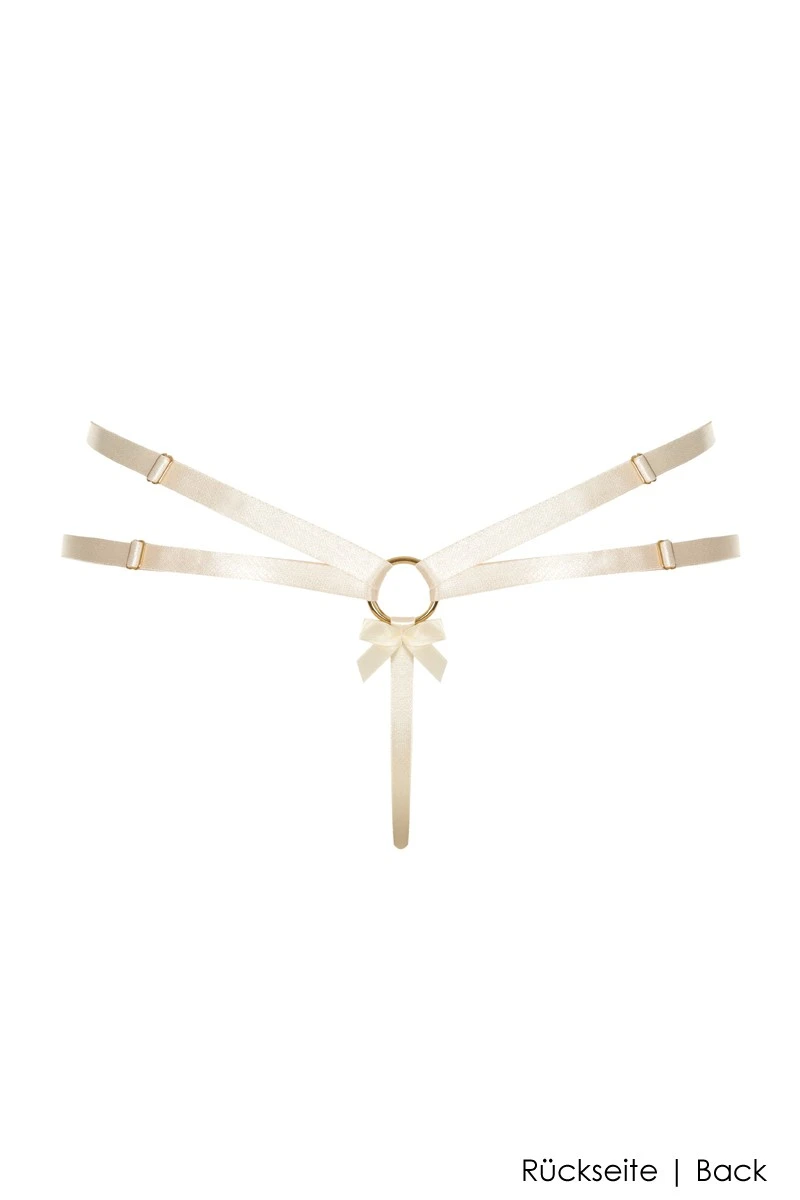 The Harness Thong / G-String matches perfectly to all the other „Cream“ coloured items of the Signature Line by Bordelle Lingerie. The Bondage inspired Design is especially alluring in contrast to the soft and transparent front of the G-String. The String can be easily fitted to your needs, thanks to the adjustable bands in the sides. Shiny satin bows and gold plated rings (18 carat gold) complete the spectacular design.