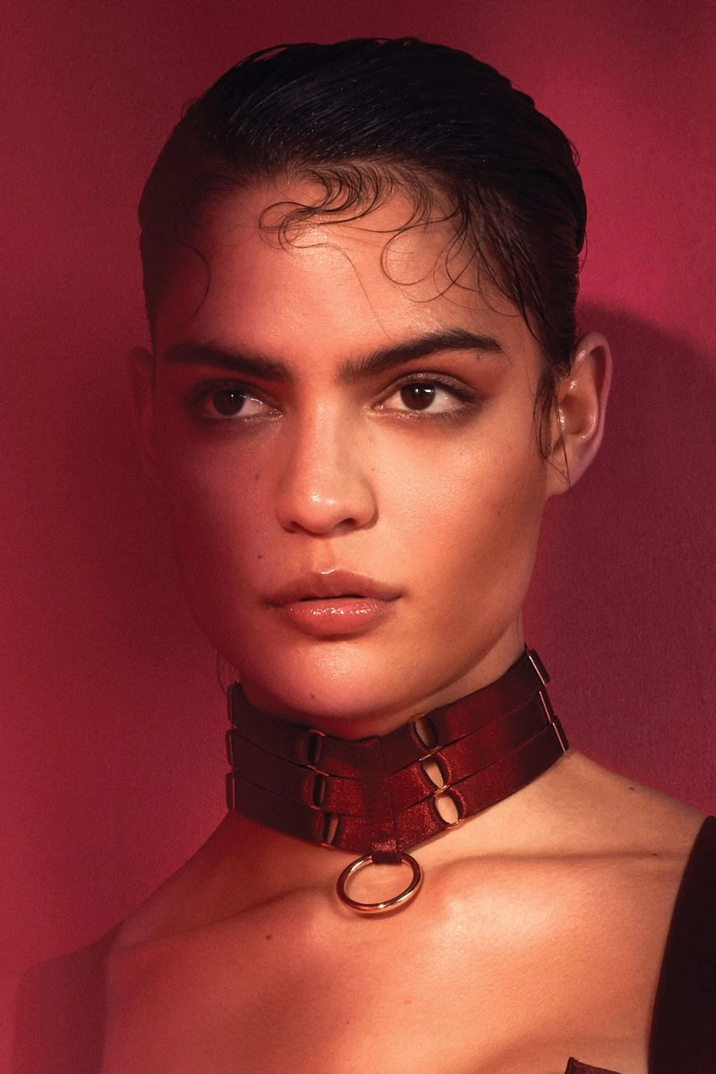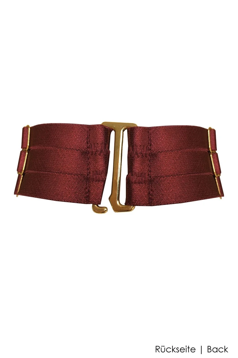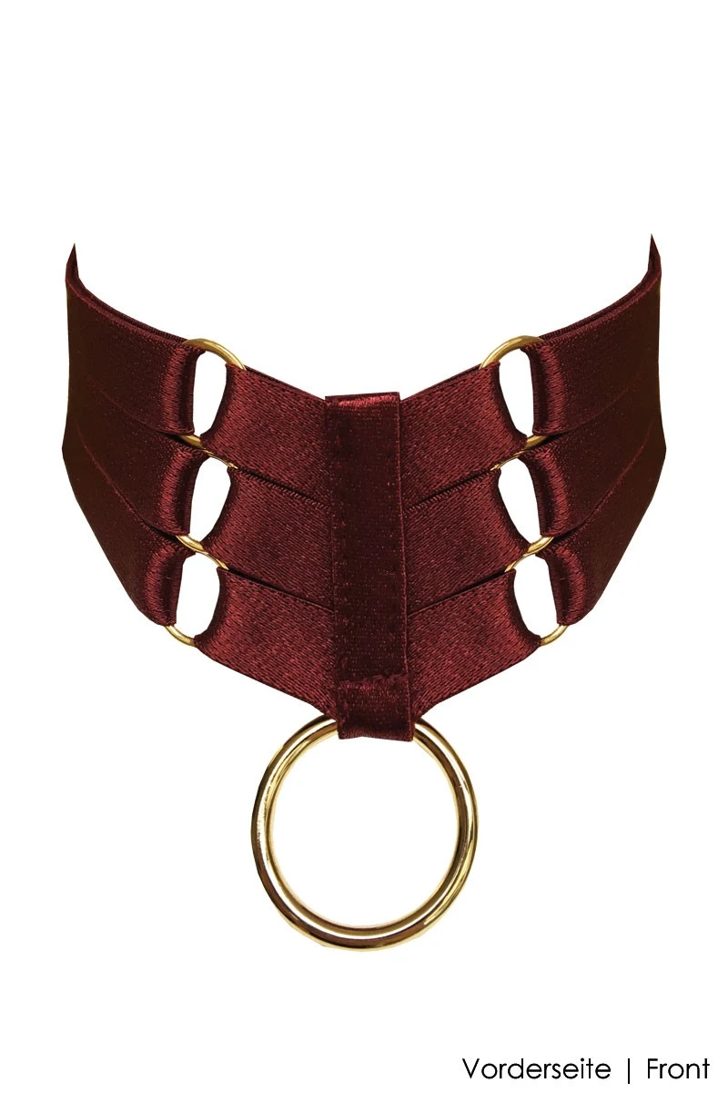 Wear this luxury Bondage Collar of the Merida Line and experience the beauty of high end boudoir accessories yourself! This tantalizing Collar is featuring 24K gold plated hardware details including a gorgeous O Ring center piece and will be the crowning piece of your Bordelle Lingerie sets. Be captivated by the contrast of the golden rings and the shiny burgundy satin bands. Elastic and fully adjustable, the collar is a joy to wear and a real showstopper!