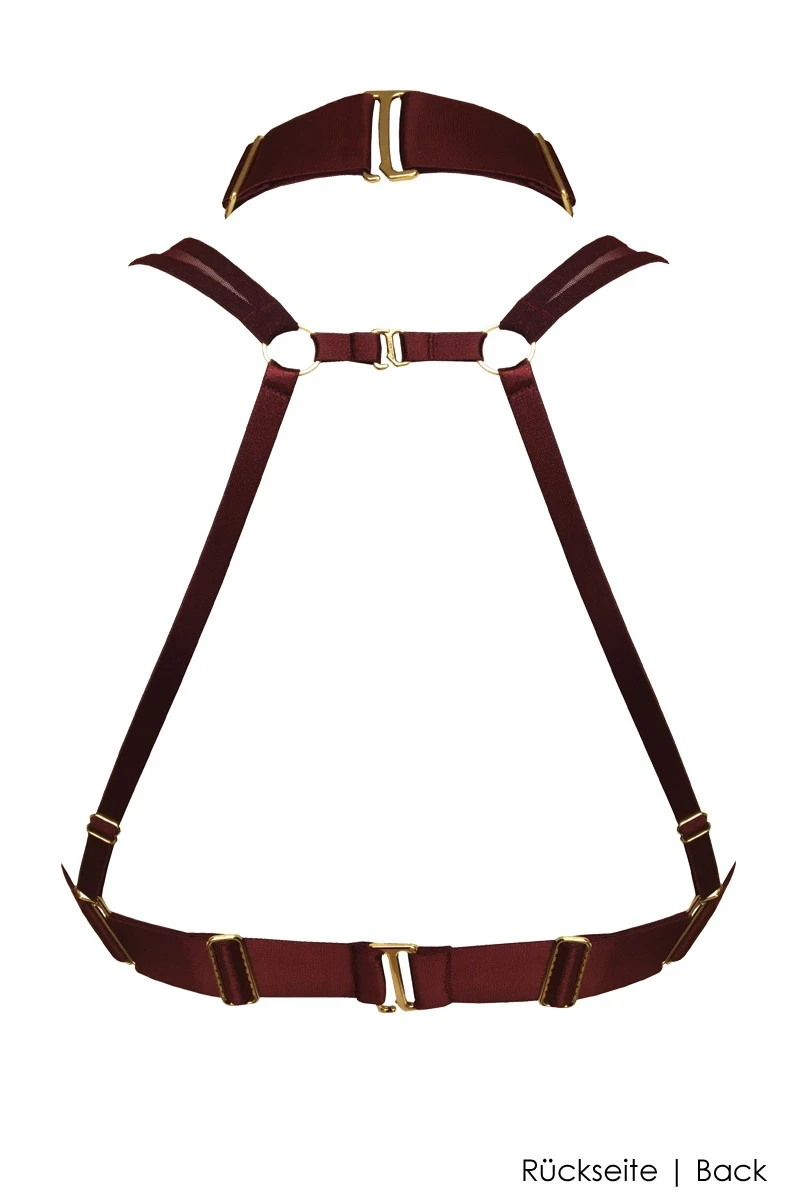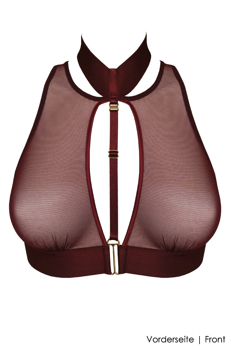 Experience the stunning and innovative design of the Merida Soft Collar Crop Top by Bordelle! The wireless Bra / Crop Top is made of transparent Mesh fabric and fully adjustable, shiny satin bands. Sexy and sophisticated, you will enjoy the figure hugging fit as well as the unique look. 24 K Gold plated hardware details are testimony to the high end finishing of this bondage inspired lingerie. Match this stunning Crop Top with various matching Bordelle Lingerie items as well as your fashion looks and show your sense and talent for the extraordinary!