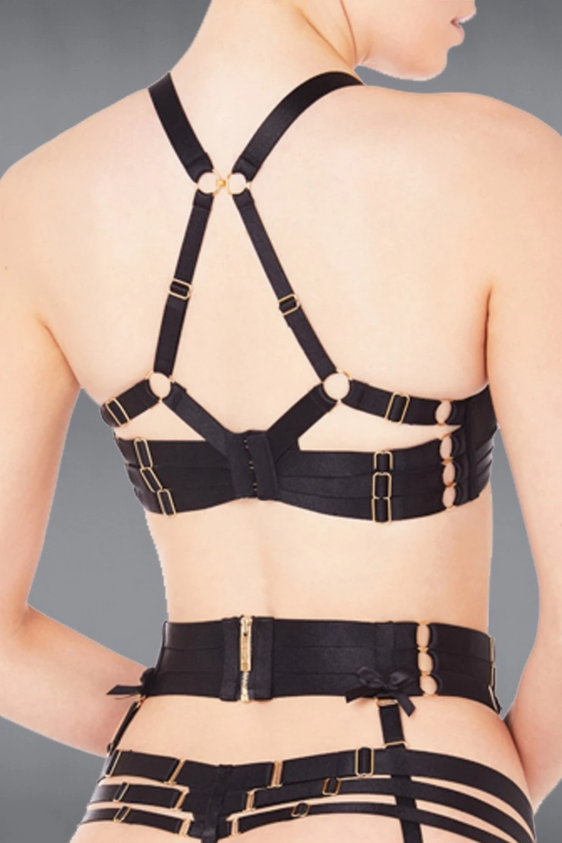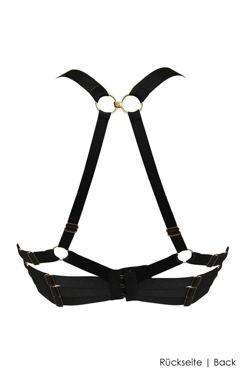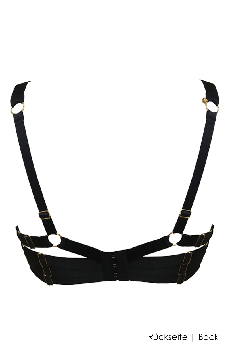 The Bordelle Signature Line Push up Bra is made of luxurious silk satin and shapes a full and beautiful bust thanks to the integrated push up polsters and wires. In addition to the shiny silk, a „strappy“ bondage design in the back takes the allure of the bra to the next level. The elastic bands are easily adjustable and feature 24K gold plated hardware details, highlighting the outstanding quality of the design. The shoulderstraps can be used in the traditional way or in a gorgoeus „X“ shape (see product images). Treat yourself and your partner to this fantastic lingerie experience and enjoy every second!