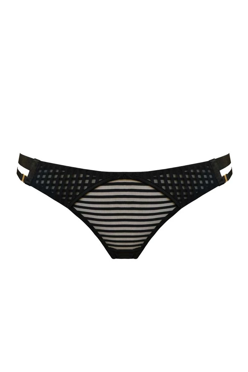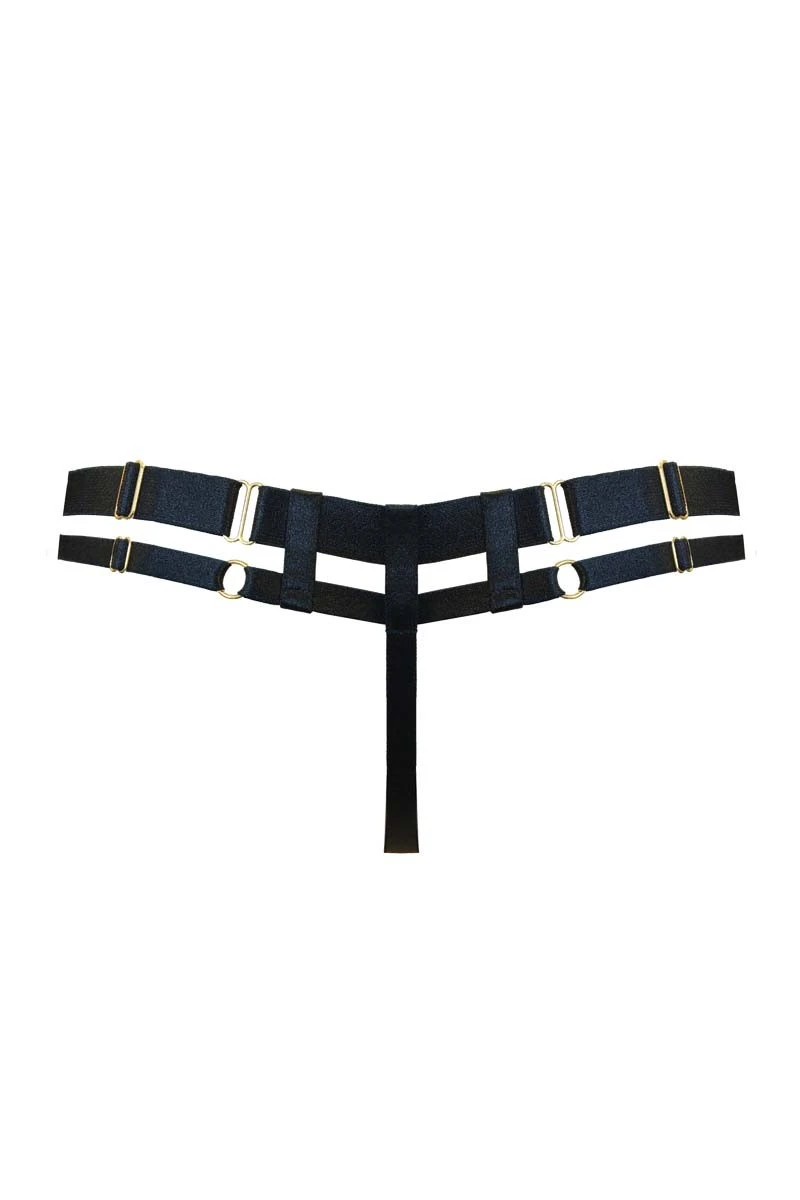 The exclusive Scala Thong by Bordelle is a sexy G-String with many gorgeous Details. Unique yet perfectly wearable under your wardrobe, it is living up to the highest expectations. The modern and soft striped-mesh is offering sensual transparencies as well as a great level of comfort. The elastic and shiny satin bands in the back are fully adjustable, further enhancing your wearing experience. 24K Gold plated components – in parts with Bordelle Logo writing – are testimony to the luxury and quality provided by Bordelle. In combination with one of the many possible Bordelle bras and accessories, you will enjoy a ravishing erotic lingerie set in an alluring „Bondage Lingerie“ Look.