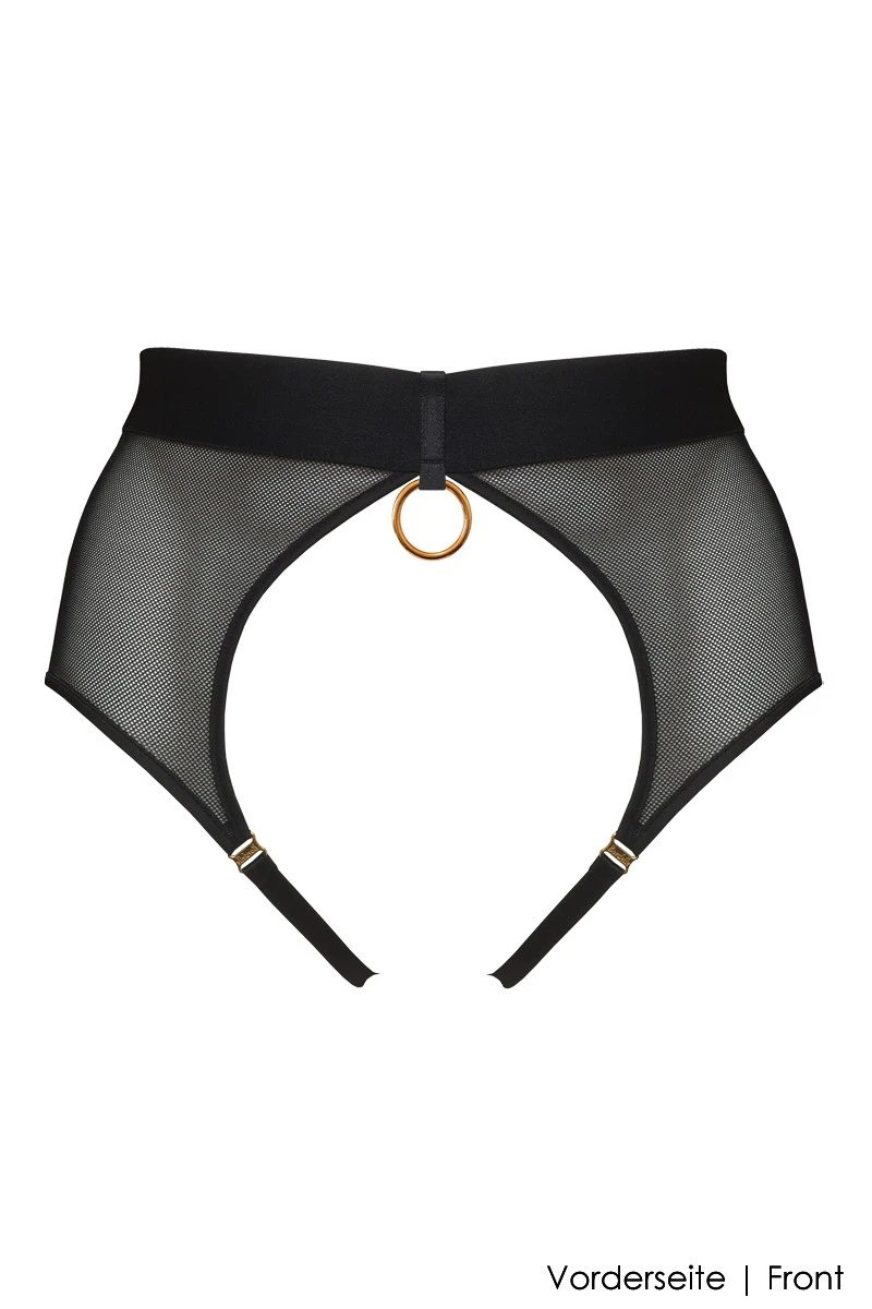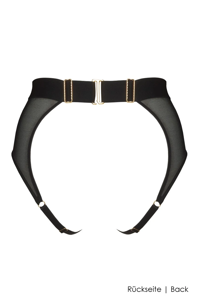 Mix and match your exclusive Bordelle Bondage Lingerie with this dazzling Ouvert Brief that beautifully compliments your buttocks and engage in memorable love play with your partner. The crotchless Ula Brief is of the highest quality featuring fully adjustable satin bands for the perfect fit and framing effect. Glamorous 24K gold plated hardware details with an oversized O-Ring and hook are crowning the sophisticated design.