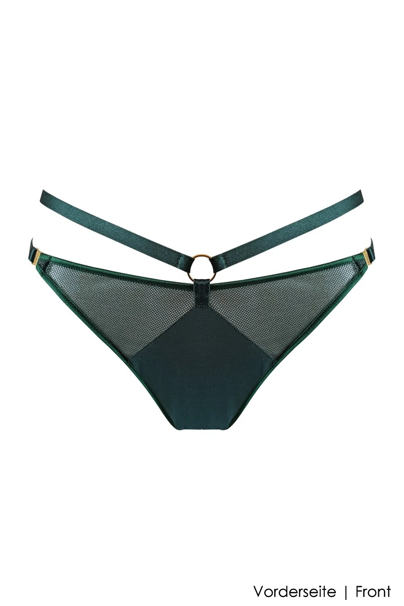 The handcrafted Ula luxury Strap Thong by Bordelle is offering all the perks of high end bondage lingerie! Made of see through mesh with a metallic/wetlook finish and fully adjustable elastic satin bands, 24K gold plated hardware elements are crowning the lavish and sophisticated design. Thanks to the playful „Mix & Match“ concept of the english luxury brand Bordelle, you can become creative and put together stunning lingerie looks for any occasion. Make us of our „Complete the Look“ product slider offering you a variety of matching items for an immersive bondage lingerie experience.