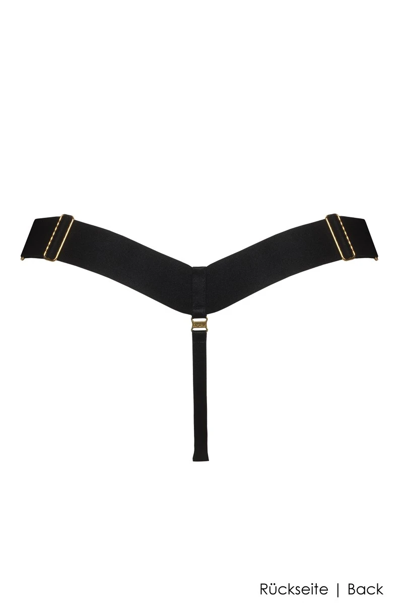 The black Ula Thong is a timeless piece of lingerie that offers comfort as well as an extraordinary design. Made of finest see through mesh and 24K gold plated hardware details, the sophisticated Ula G-String is a bondage inspired bottom for discerning women. Make use of the various „Mix & Match“ options from our „Complete the Look“ Slider and put together a show stopping look that does your beauty justice.