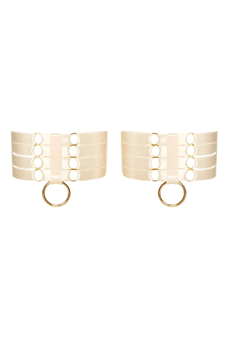 This pair of cream coloured Garters in a sexy Bondage Lingerie Look is the perfect addition for your Bordelle Selection. Either worn in combination with a garter belt / harness or with thigh high stockings, there is no limitation when it comes to the use of this luxurious set of garters (see Pic No.5). The 24K gold plated rings are a true eyecatcher in combination with the elastic cream coloured straps. Each strap is individually adjustable, making this item the perfect gift.
