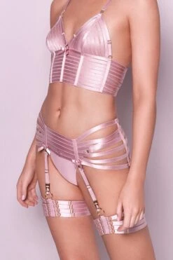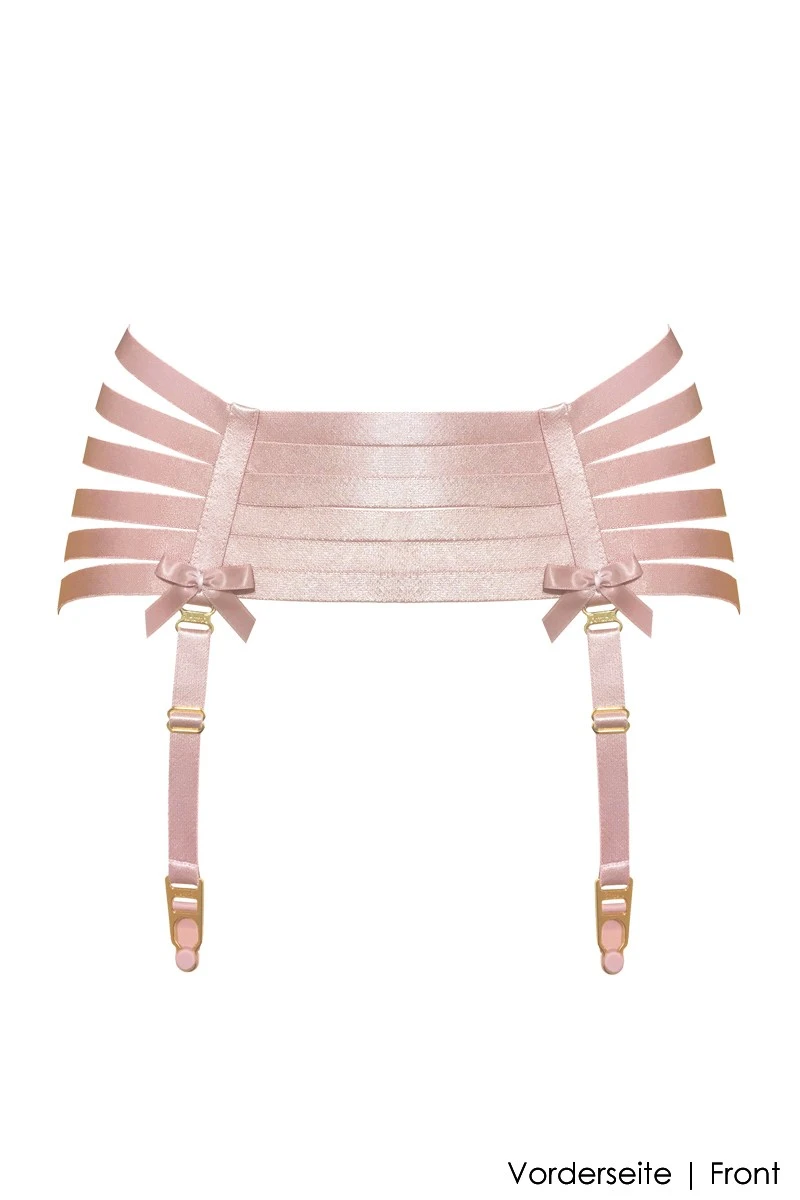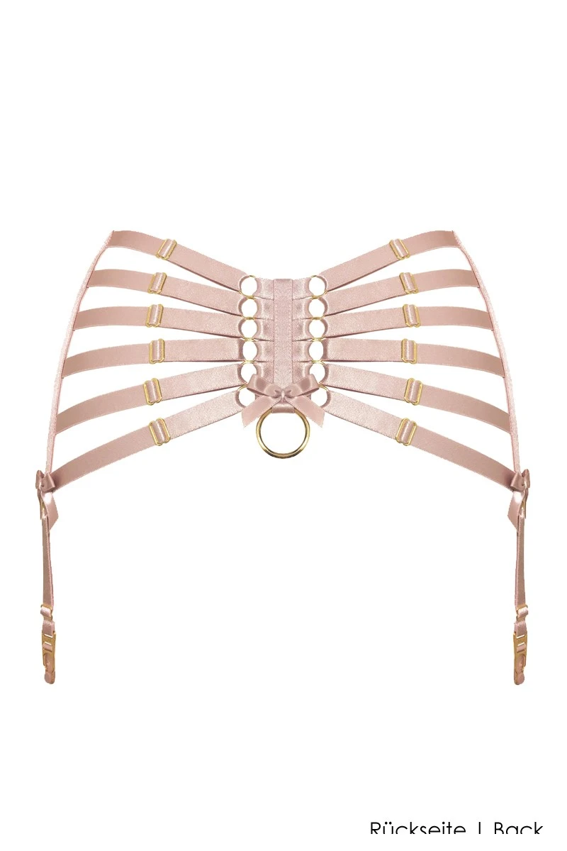 The bondage inspired 4-strap Webbed Suspender Garter Belt is an erotic lingerie highlight that perfectly accentuates your femininity. The rose coloured elastic bands are adjustable on the backside and create a beautiful look with the big 24K Gold plated elements. The decorative and playful golden ring in the center back is just gorgeous. In the front, small satin bows are crowning the unique design of this Atelier Bordelle Highlight! Enjoy all the mix and match options of the Bordelle Signature Line and celebrate your beauty!