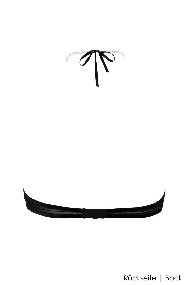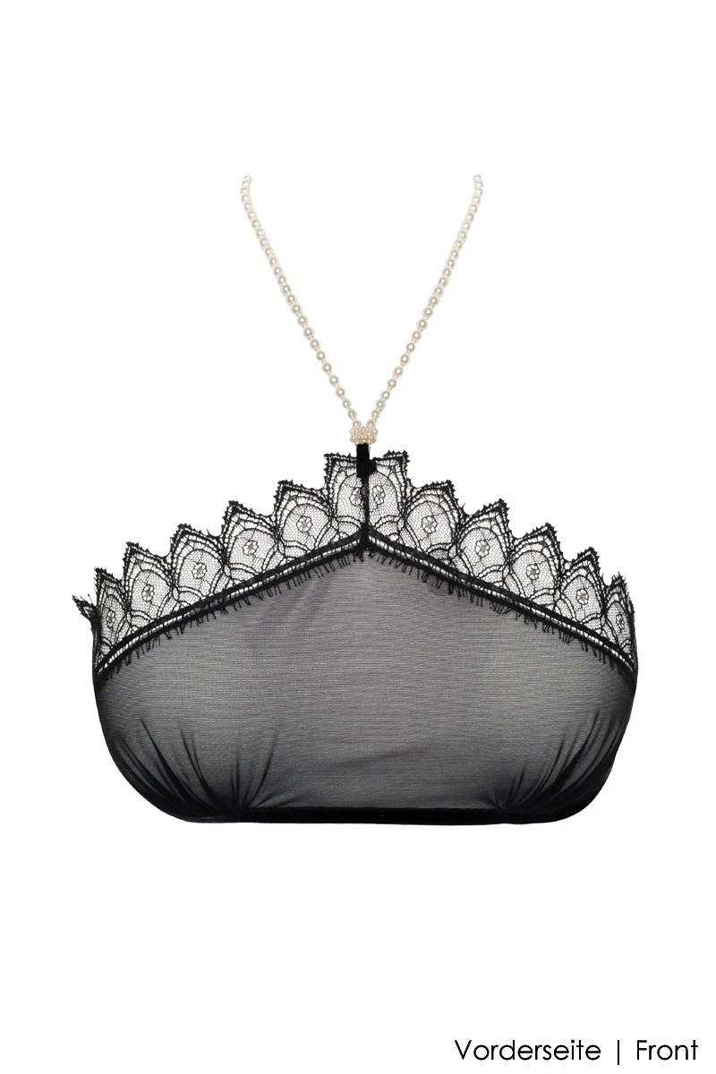 The elegant Kyoto Collection Halter Top / Bandeau Bra is made of finest Leavers lace, elastic tulle and an elastic underbreast band of shiny velvet. A decorative chain made of exclusive mallorcan Pearls is being closed in a neckholder style, providing a great fit and support. Wear this Kyoto Highlight with one of the matching Kyoto bottoms and enjoy a Bracli highlight set.
