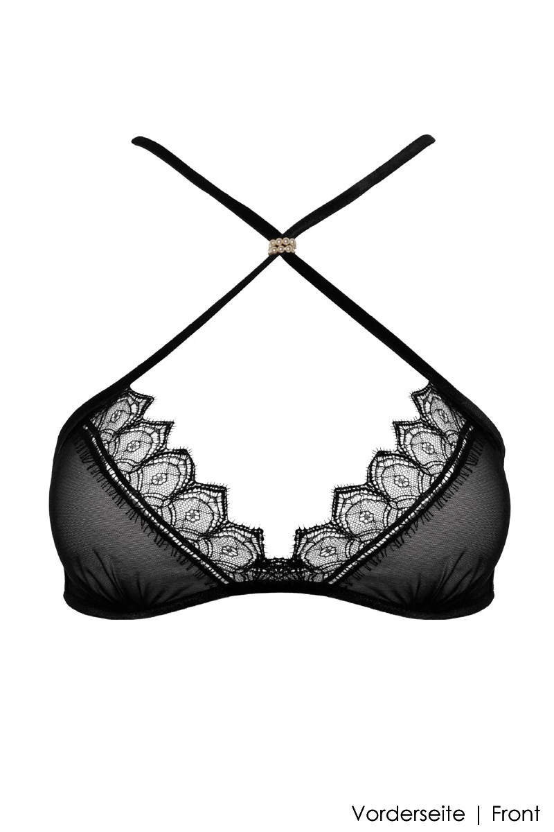 The Kyoto Collection Triangle Bra is just gorgeous. Made of high quality leavers lace, elastic tulle and shiny velvet bands, the genius design creates a natural Push-up effect. The adjustable shoulderstraps cross decoratively in the center front, being hold together by two loops made of exclusive mallorcan pearls. Matching to the super hot Kyoto bottoms, this elegant Bra is the perfect match. The item is being delivered in a high quality Bracli gift box for the perfect surprise!