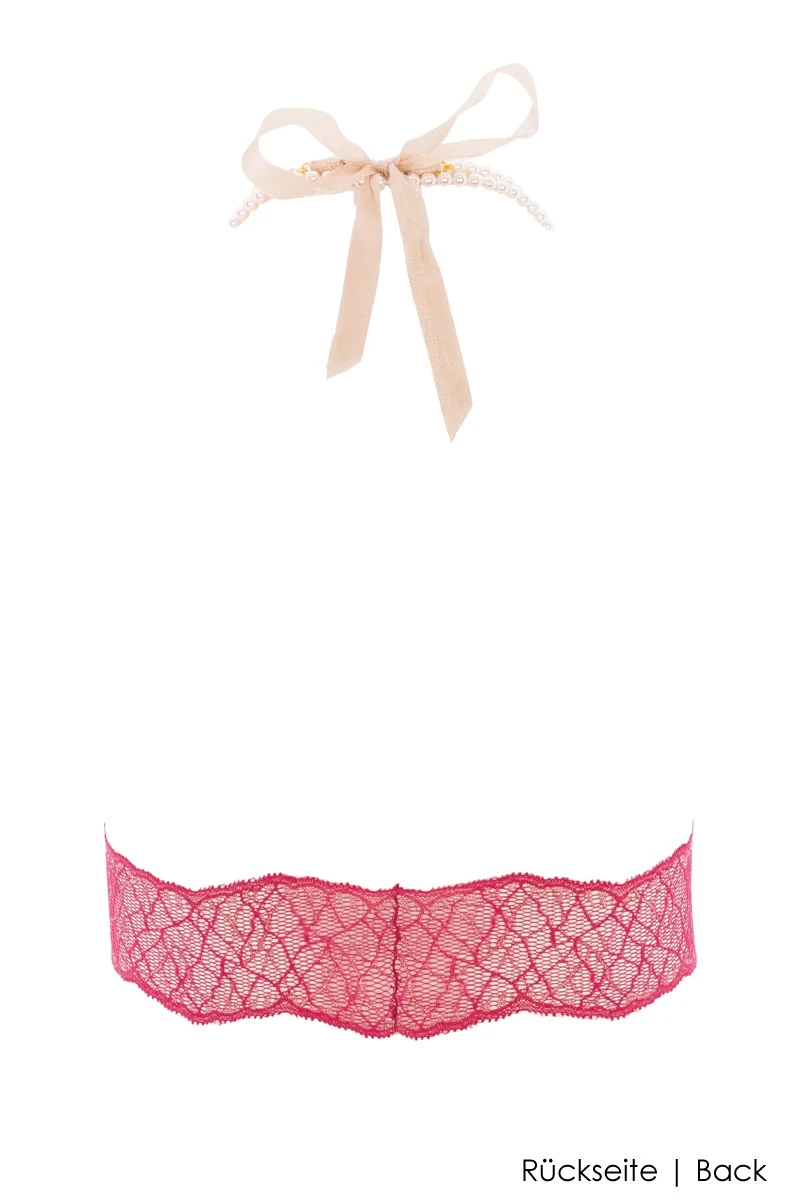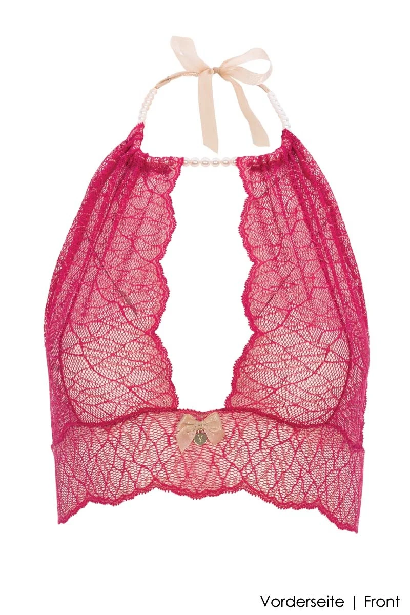 Made in Spain and perfectly matching our range of stimulating Sydney Pearl Thongs, this show-stopping see-through Bralette features the same red italian lace with golden lurex highlights. The wireless bra surprises us with an integrated, cream coloured pearl chain necklace that is being closed with a satin bow in the back. You will love the weight and feel of the shiny Manacor Pearls from the balearic island of Mallorca. The underbreast band of the lace bra is elastic, therefore providing the perfect fit and wearing comfort. A small satin bow with a golden BRACLI pendant is crowning the center front of this gorgeous bralette in fiery red.