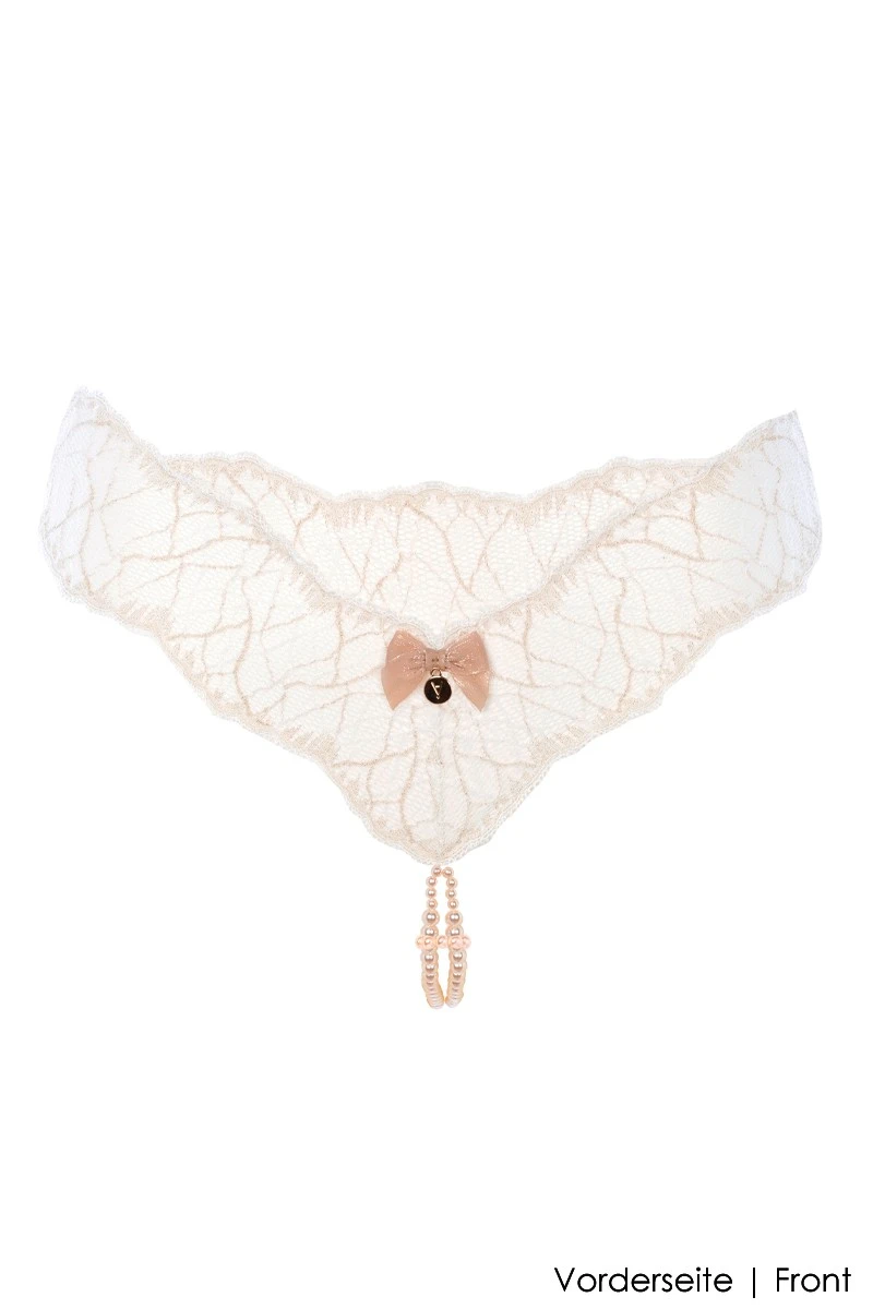 Treat yourself to the electrifying stimulation of the „Sydney Double“ Pearl Thong made of italian lace with golden lurex highlights and high quality manacor pearls from the island of Mallorca. This particular style is offering the patented Bracli design with a double stranded, creme coloured pearl chain for a maximum of pleasure. Enjoy yourself wherever you go, wearing your sweet secret underneath your favorite outfits and get to know the many benefits of open thong lingerie for your love play.