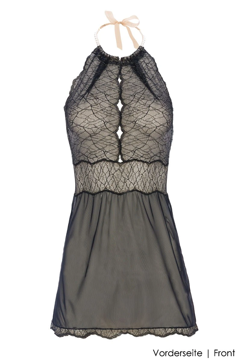 As an addition to our range of Sydney line pearl thongs, we do recommend the Sydney Slip Dress. Made of finest italian lace with woven in golden lurex threads and tulle, the see-through Negligee is a sight to behold! To be closed with a decorative satin bow in the back of your neck, the integrated pearl chain necklace is a gorgeous detail. The creme coloured manacor pearls from the balearic island of Mallorca just look amazing on all skin tones. The Slip Dress itself is elastic and offers a superb wearing comfort.