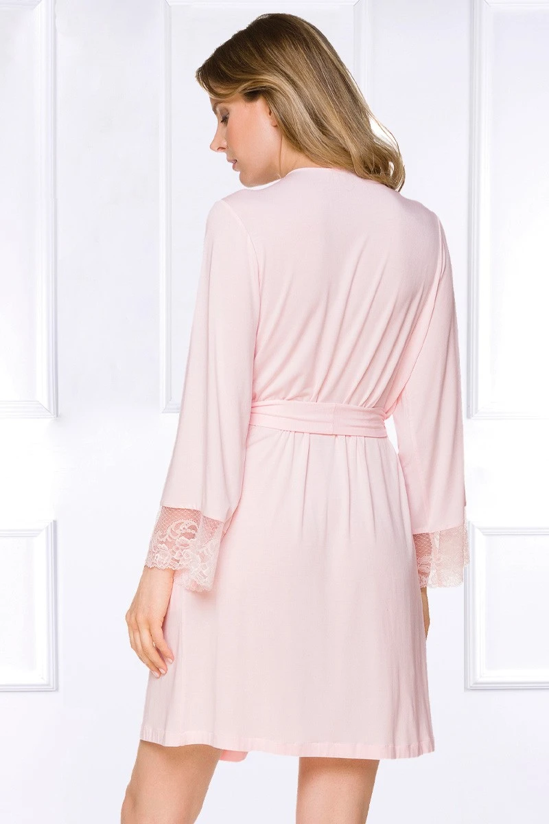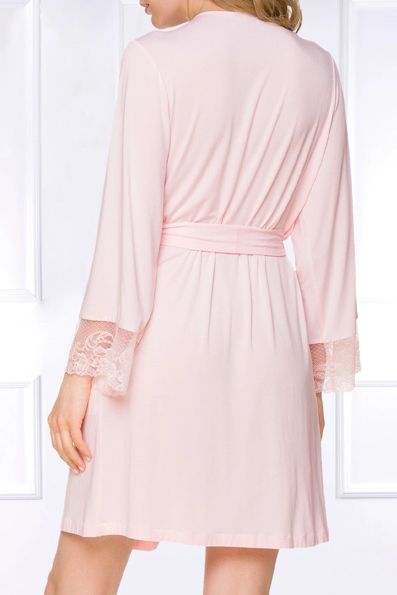Wear this silky smooth Kimono on bare skin or in combination with the matching nightwear pieces of the Aurora Line and enjoy the unique wearing comfort of high quality micromodal and precious lace in a floral design. The see through lace at the cuffs adds a lovely lightness and elegance to the sophisticated design. Used as a beautiful morning robe, elegant loungewear with a nightdress or pajama or even as a seductive piece in your boudoir, the soft rosé coloured Kimono is a multi talented gem that takes care of your well being.