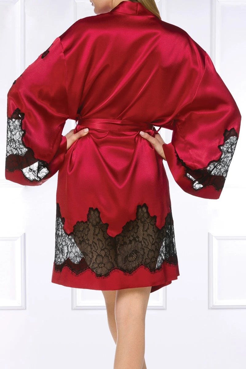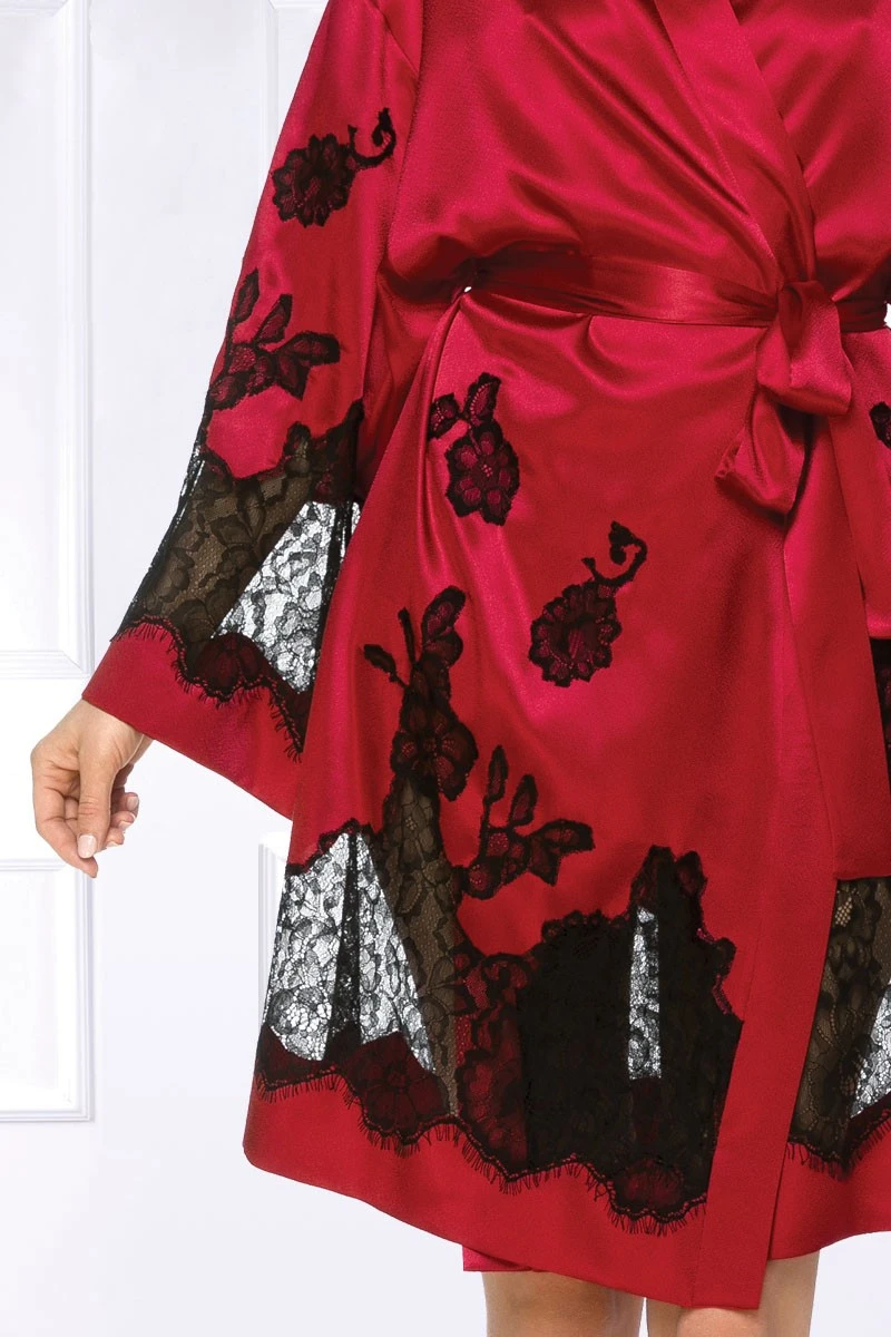 This hot red satin Kimono with black lace applications and inserts is as elegant as it is playful. Wear it with the matching nightwear, your favorite erotic-lingerie or just on your bare skin and you will feel and look amazing! Tie the Kimono with the matching satin waistbelt and enjoy it as sensual loungwear at any time of the day. Should you be looking for truly special gift for your loved one…this is it! This high quality Kimono is 100% Made in the EU and shipped in a gorgeous Coemi box.