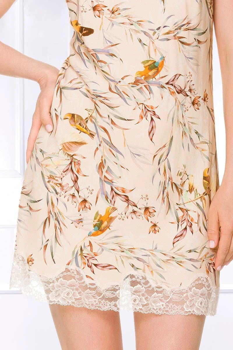 The beautiful and summerly Birdy spaghetti strap nightdress is made of breathable viscose adorned with champagne coloured lace. The floral print with exotic and colorful birds on the sand coloured fabric is absolutely brilliant and always a joy to look at. But it doesn´t stop there….the elegant open back with decorative straps, as well as the decolleté and hemline are all featuring precious lace inserts that add a cloud like lightness to the stunning design. The matching Birdy Kimono is available in the „Complete the Look“ Slider just above.