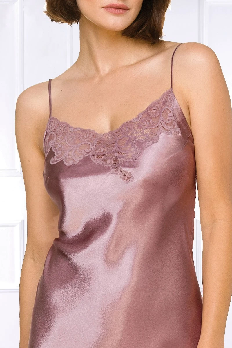 This shiny satin Slip Dress in dusty pink is a lovely combination between femininity and sophistication. A sexy piece that is so alluring, it will leave your partner breathless! It has a very easy fit and embraces your body in a beautiful way. This Slip Dress is featuring inserted floral lace along the cleavage and hemline, creating sexy transparencies. On the back it has a deep V-Shaped back with artfully incorporated floral lace, and decorative crossed spaghetti straps. Don’t forget to complete the look with the matching satin Kimono from the same Eline line.