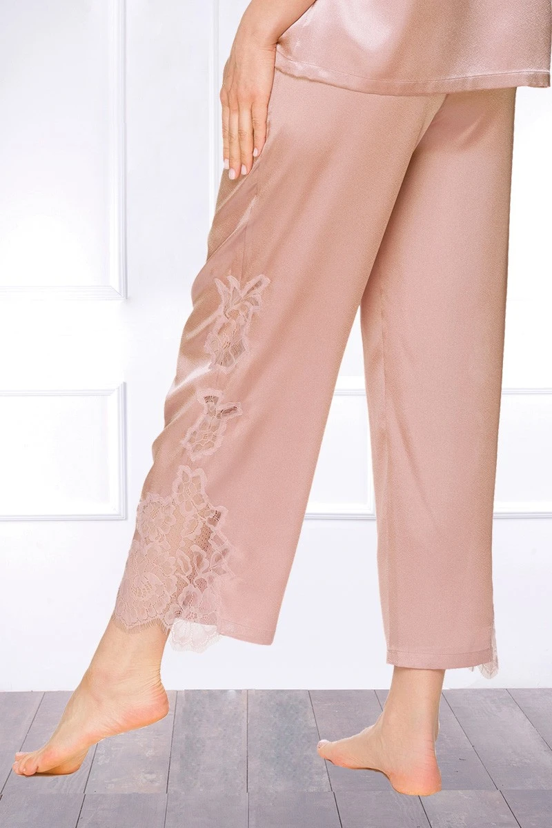 This exclusive short sleeved Satin Pajama in a pastel powder tone is 100% made in the EU. Lavish lace inserts at the legs, shoulders and back of the pajama are adding sensual transparencies that catch the eye and a lovely lightness to the design. An elegant shawl collar, satin covered buttons and a pair of extremely comfortable pajama pants make your satin nightwear experience an everyday luxury of the most beautiful kind.