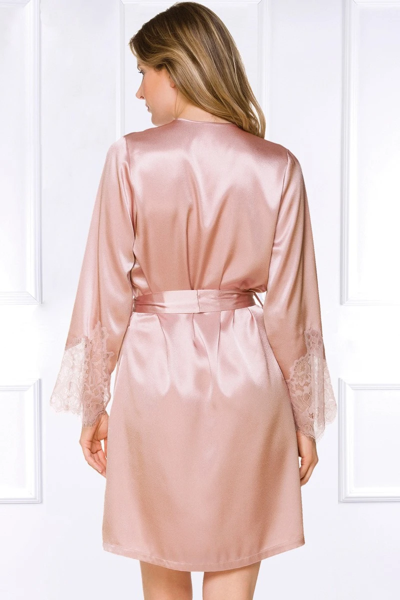 On the couch, at the breakfast table, after the shower or dressed as a sexy surprise, you will love the many talents of this exclusive satin kimono / morning robe. Simply close it with the included waist belt and you will enjoy a comfortable fit as well as a lovely silhouette that beautifully highlights your femininity. Look at the lace that had been decoratively inserted into the sleeves…the love for detail and superb quality really shows.