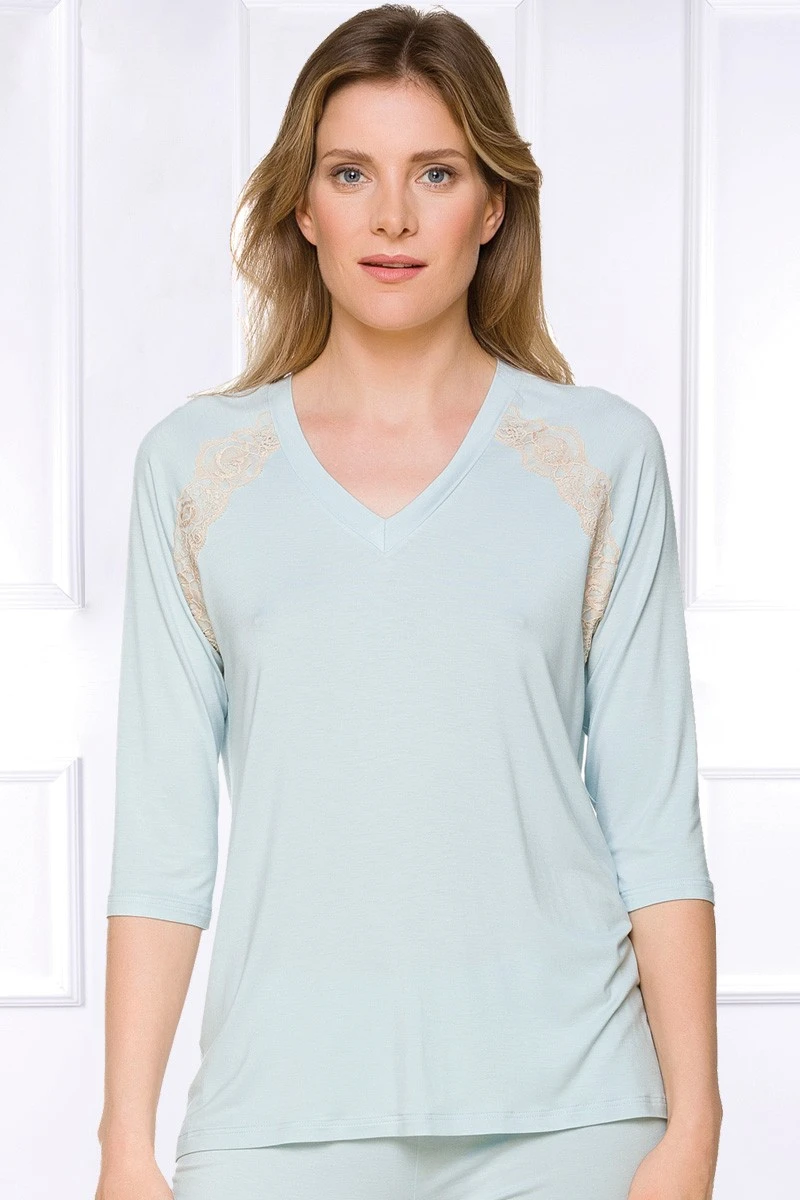 This exclusive Pajama Set is an excellent choice if you are looking for an incredible level of comfort, quality and style. Recharge your batteries lounging and sleeping like you are on clouds thanks to the silky smooth micromodal fabric. Enjoy the beautiful light blue colour and decorative lace applications. This cozy Pajama Set with stetchy pajama pants is a well deserved everyday luxury as well as it is a blessing for your soul.