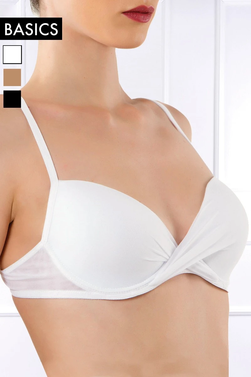 Diletta is a modern Push-up Bra designed to be your perfect everyday companion. Comfortable and with great fit, this Bra creates a beautiful cleavage thanks to its push-up effect and the sophisticated cross draping detail on the front center. Diletta has smooth padded cups, inserted wires, removable pads and adjustable shoulder straps. Designed to be worn under any type of clothing and provide you with a great wearing sensation thanks to its refined Microtulle fabric. Combine this Bra with a suitable bottom from the same Microtulle Series by Cotton Club Basics.
