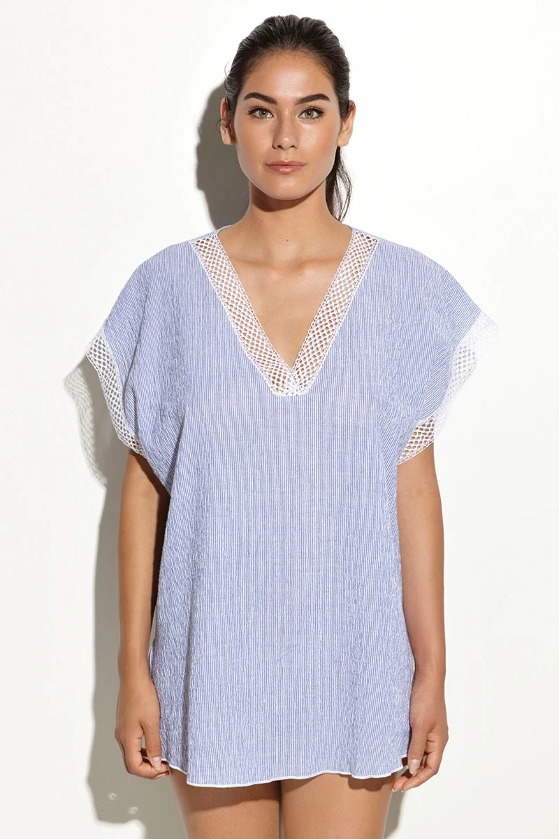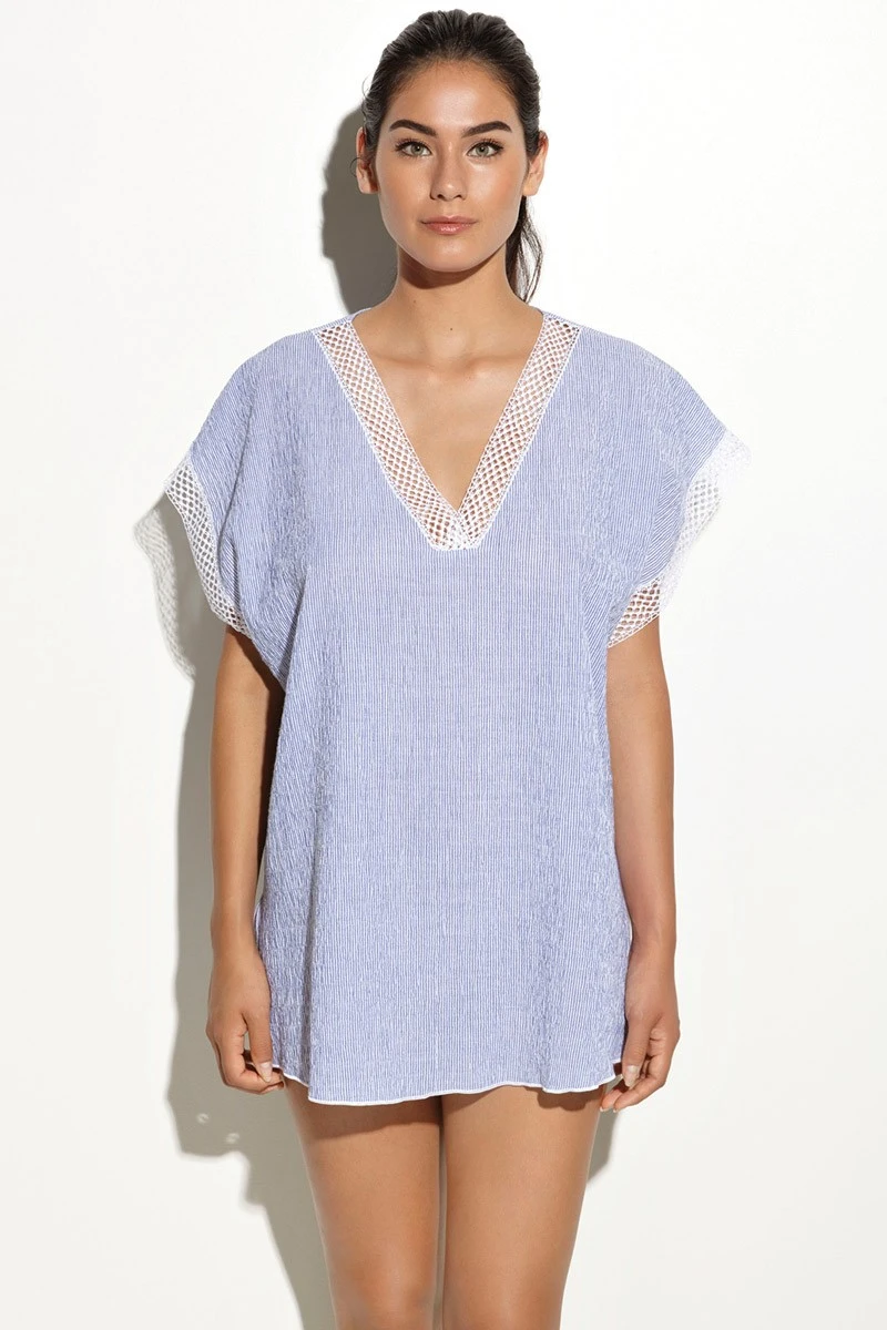 The fine blue and white stripes of this gorgeous Cotton-Tunic create a stylish maritim look. Perfect in combination with your Bikini or simply as a summer fashion highlight, you can enjoy the sunniest days of the year in style! The white mesh has woven in golden lurex threads that create a subtle and special look.