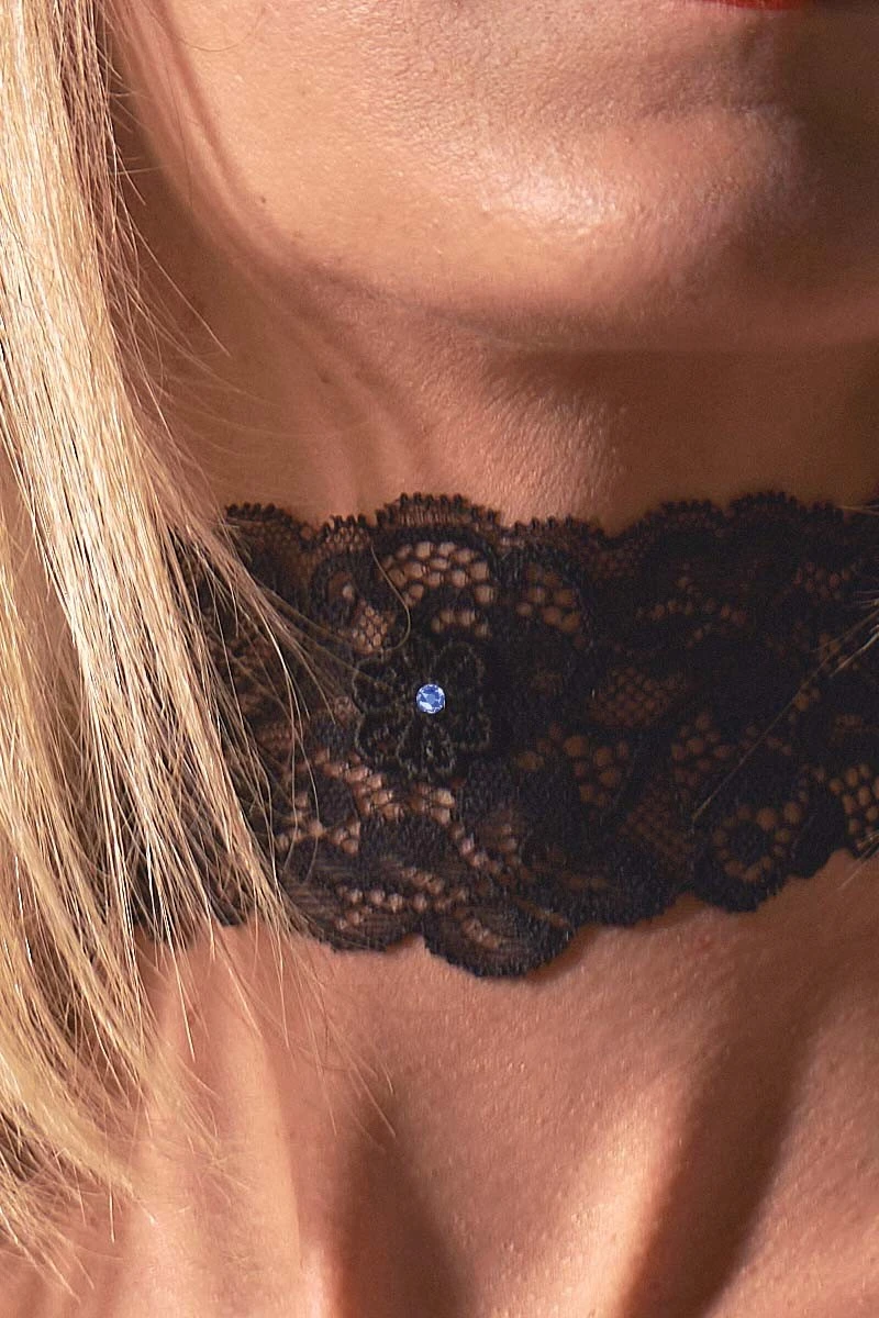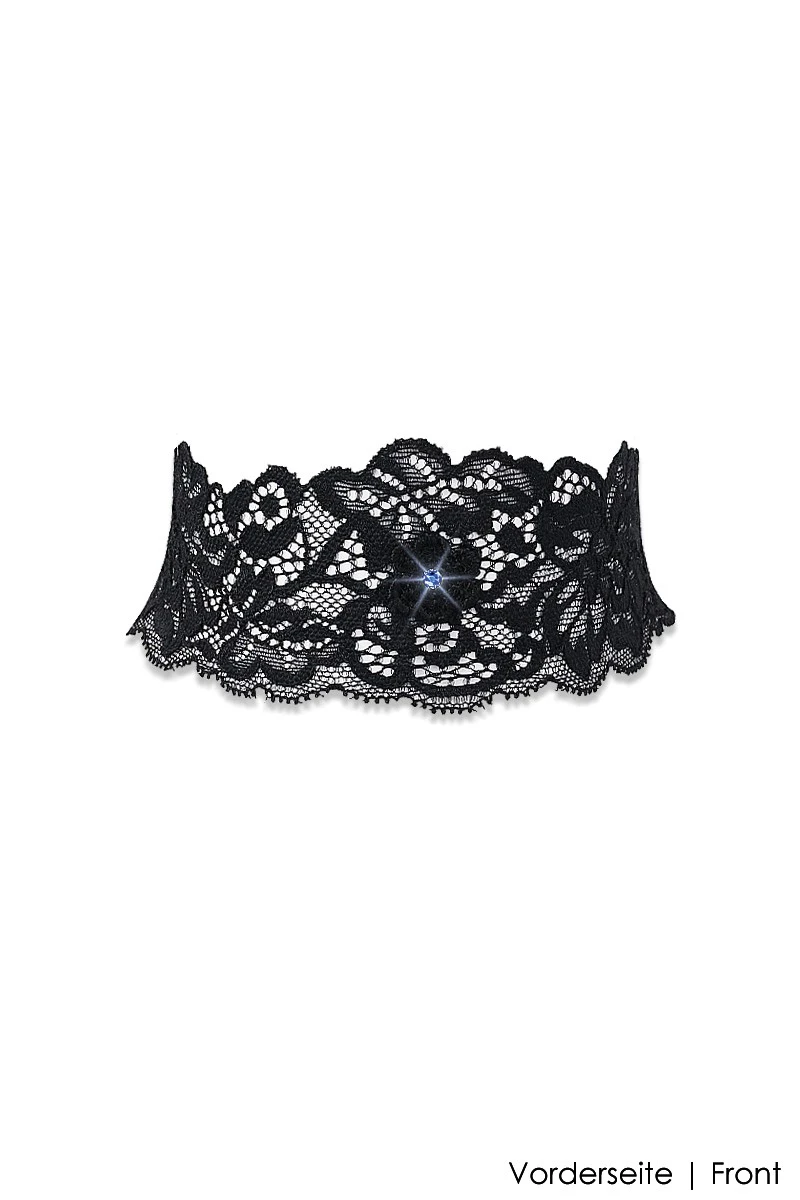 This exclusive Collar by Luxxa is the perfect accessory to add a romantic touch to any outfit. The black floral lace with a blossom detail that is being crowned by a shiny blue rhinestone crystal make the Collar a particularly elegant piece. The elastic fabric ensures a perfect fit around the neck and is comfortable to wear. It is the perfect accessory for those who appreciate the beauty in the small things in life. The Collar matches perfectly with all items from the Idylle line and can be combined to create a uniquely romantic and playful look.