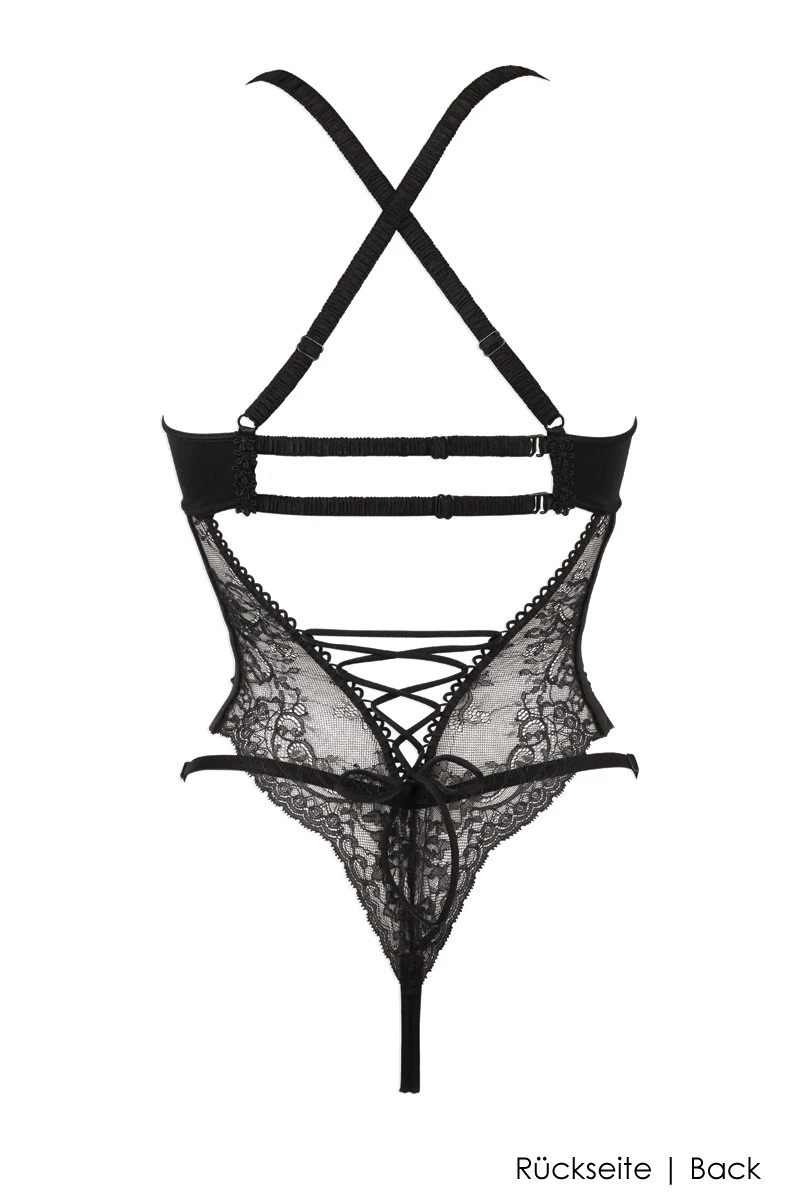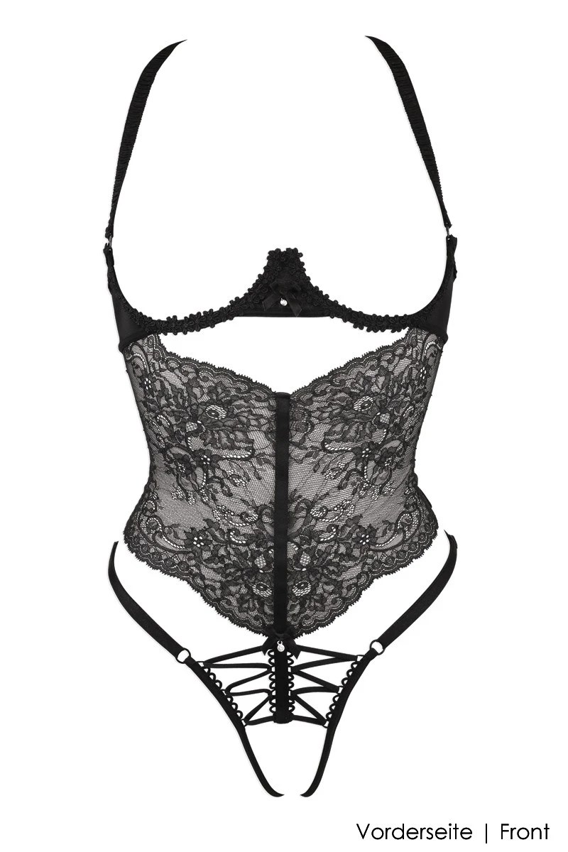 This exclusive Playsuit with open/naked cups, a crotchless design and two Swarovski Crystal pendants in the center front, is an absolute stunner as well as a sensual pleasure to wear. 100% Made in France, you will enjoy erotic play at its finest and experience the unrivaled quality of handmade french erotic lingerie. Finest french lace, guipure details on the integrated wires and a beautiful lacing detail are just the perfect framework for your breathtaking femininity.
