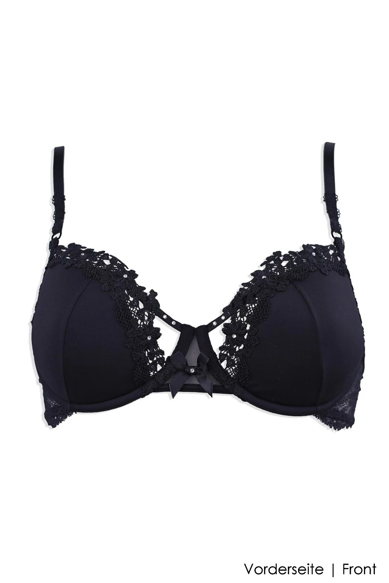 With this luxurious soft padded Full Cup bra you can create many sexy lingerie combinations, thanks to the fully modular concept of the Borsalino Line. Handmade of french Guipure lace and finest tulle, you will enjoy the elegance and comfort of a unique design that highlights your beauty. A decorative satin bow and sparkling Swarovski Crystals adorn the center front. Fully adjustable in the back, you will enjoy perfect fit and support. Treat yourself and your partner to this stunning luxury bra and the various matching items of the same line.