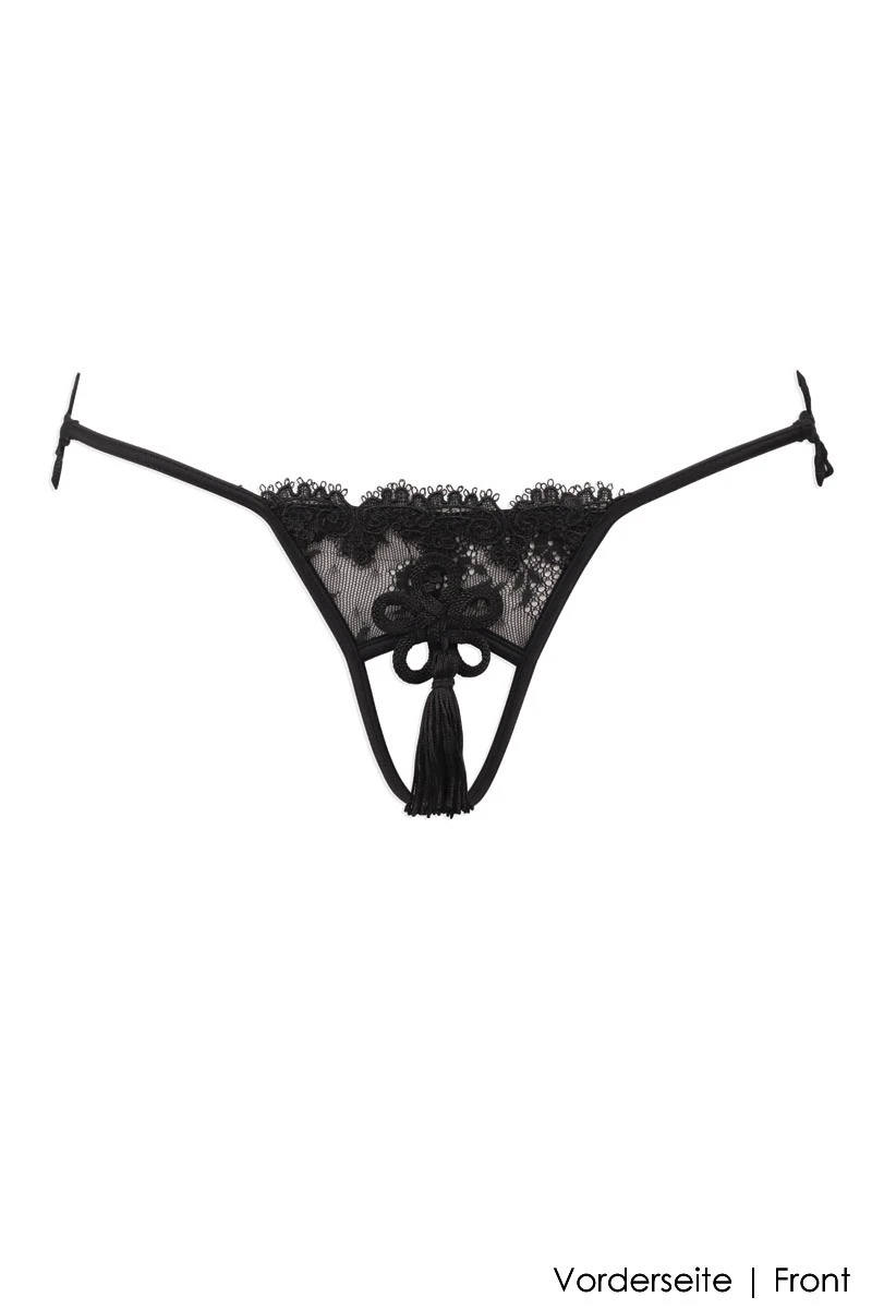 You love to seduce your partner with your spontanity, daring nature and sexy self confidence?! This exotic Open Thong 100% handmade in France is going to take your love life to the next level. The crotchless design with elastic bands allows for your love play to be . Floral details in the center front and back are featuring elegant tassels that will hypnoticially swing from left to right with every move you make.