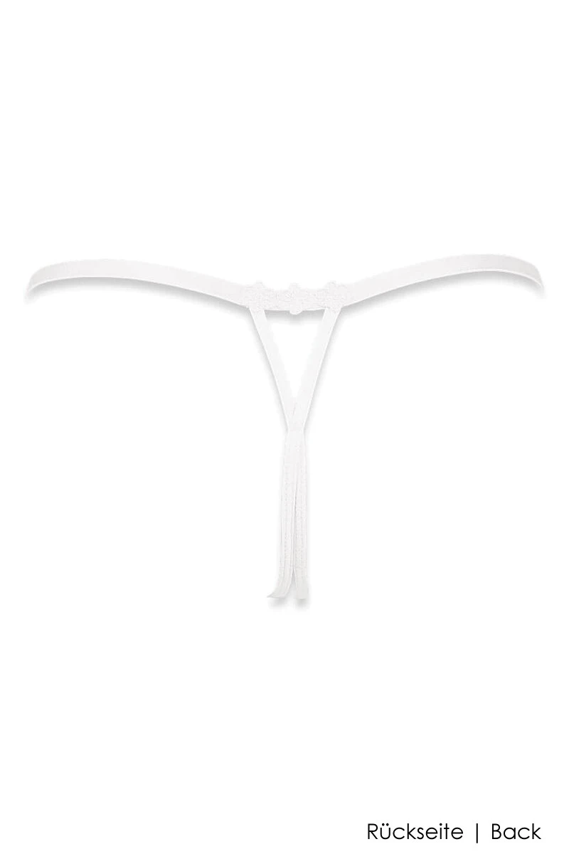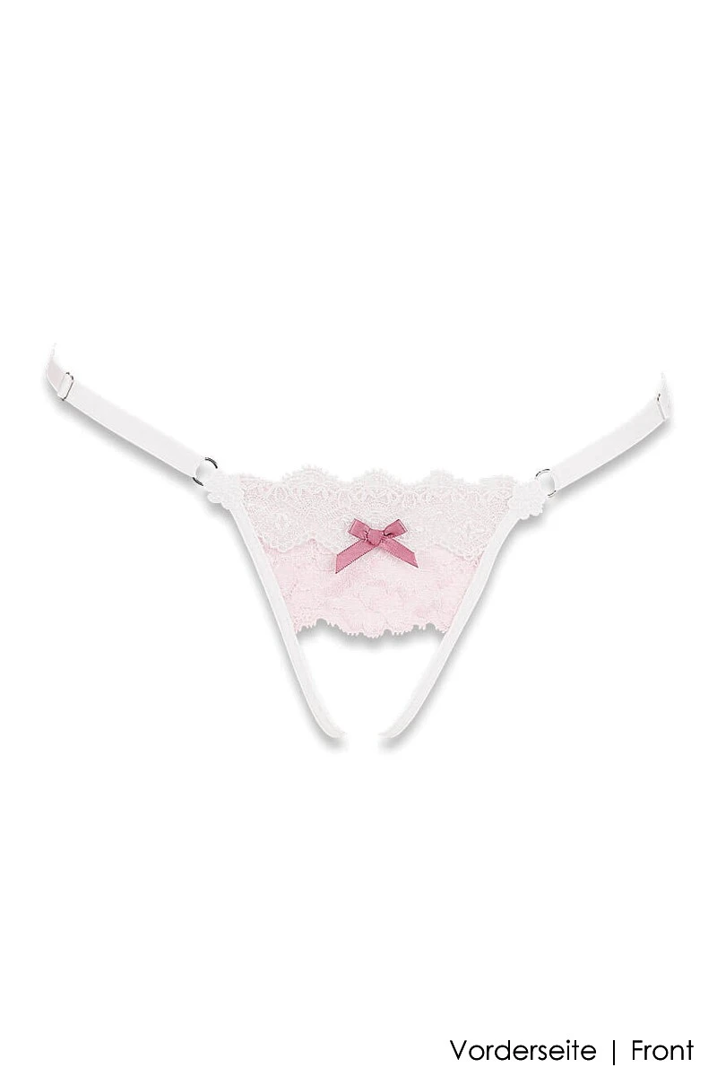 Treat yourself to the „Girly Line“ crotchless open thong and we guarantee you moments of passionate love play with your partner that you will never forget! Just perfect for a steamy encounter, the crotchless G-String is the most alluring in combination with the matching Girly Line bras. The pastel pink lace had been adorned with white Guipure lace from Italy and a shiny satin bow in the center front. The Open Thong is made of stretchy lycra and offers an additional adjustment option on each side. Enjoy your sweet secret on a night out in the city or back at home with your partner. One thing is for sure…it is time to play!