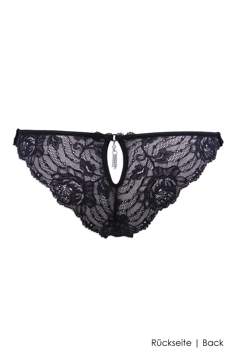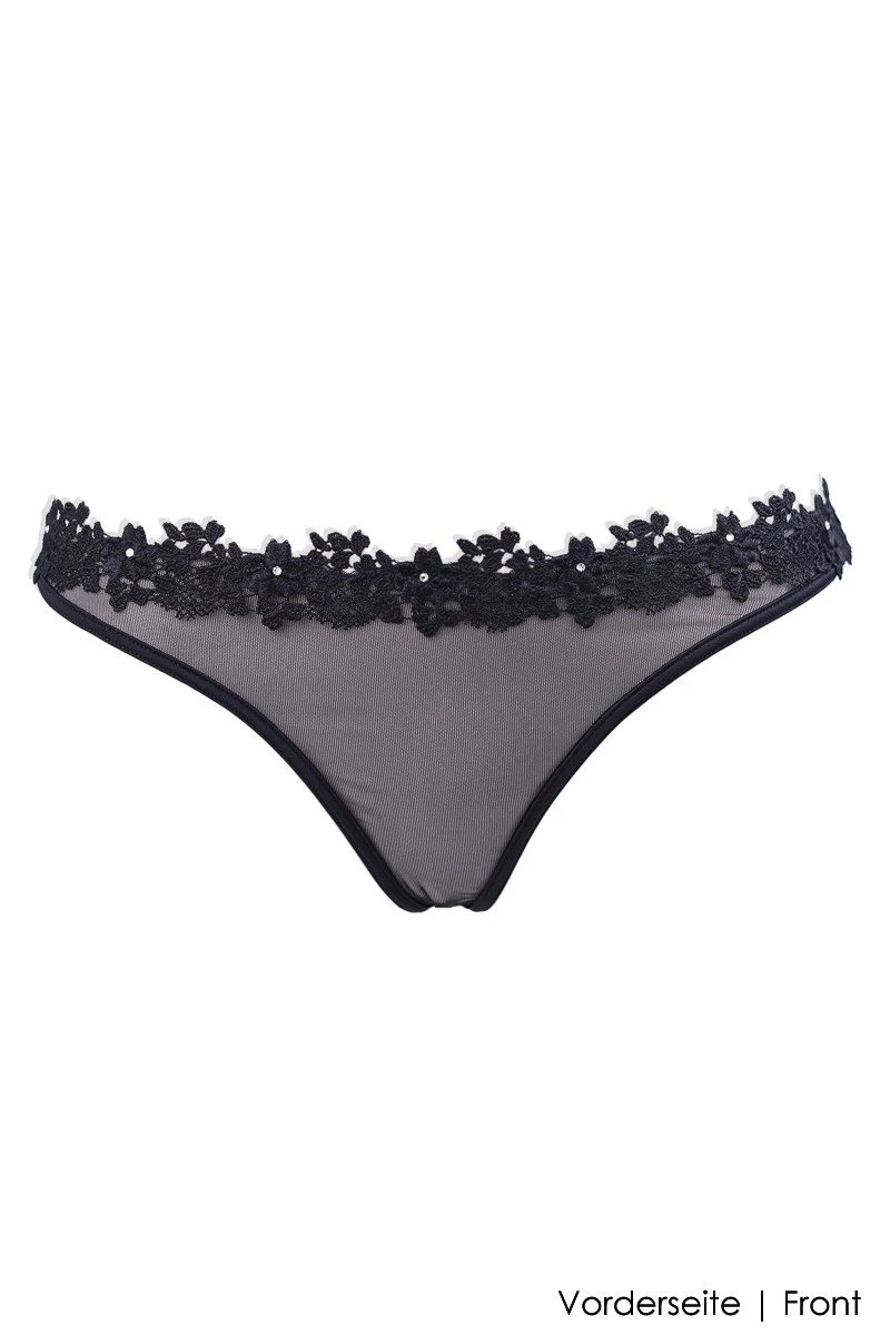 The Borsalino Tanga in a sexy Brazilian Cut is truly a sight to behold! Alluring transparencies and sparkling Swarovski Crystals all around, create a very special lingerie experience for everybody involved. Handmade by french lingerie artisans, the floral lace and transparent microtulle highlight your feminine beauty. Finest Guipure lace adorned with original Swarovski Crystals in the front and a decorative Swarovski Pendant in the center are taking the show-stopping design to the next level.