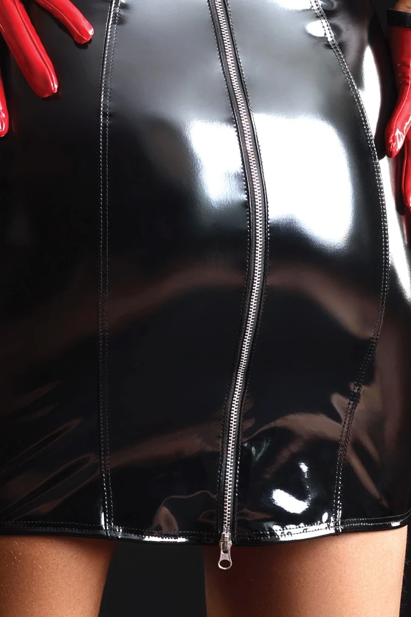 Explore the sensual pleasure of wearing this shiny black vinyl fetish dress 100% made in France. Enjoy the high quality finishing and the body hugging fit. You will find that the integrated 2 way zipper in the back is as elegant as it is useful in the important moments of life! Mix and match your new favorite Party Dress with the matching accessories from our „Complete the Look“ Slider and indulge yourself and your partner with a ravishing look!