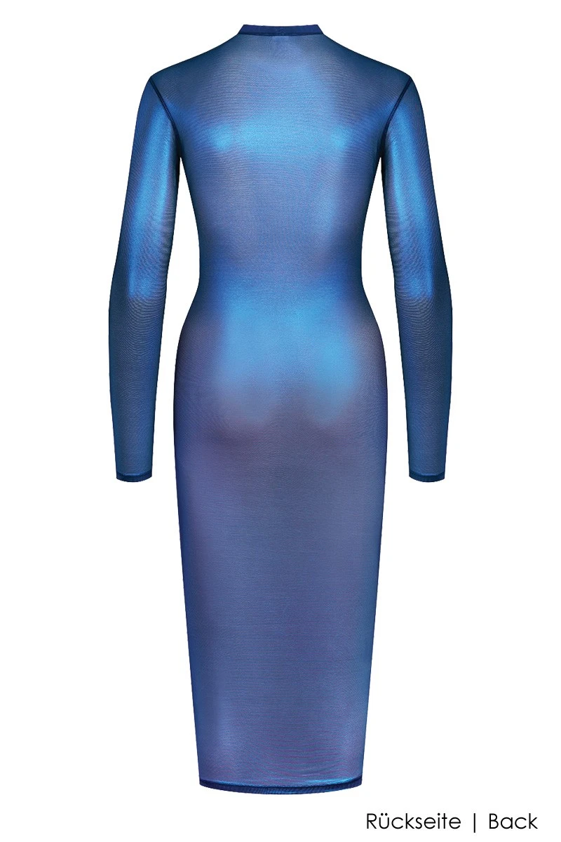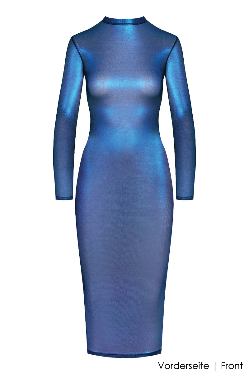 Surprise yourself and your partner as an exotic beauty from a distant galaxy and slip into this figure hugging Bodycon Party Dress. Made of shiny metallic blue stretch tulle, the see through fabric is creating a dazzling look with hypnotizing qualities. For the ultimate „Blue Angel“ experience, the matching lingerie pieces and our exlusive boudoir accessories are just a few clicks away in the „Complete the Look“ slider. So what are you waiting for?! Treat yourself and your favorite earthling on a magical ride to the stars.