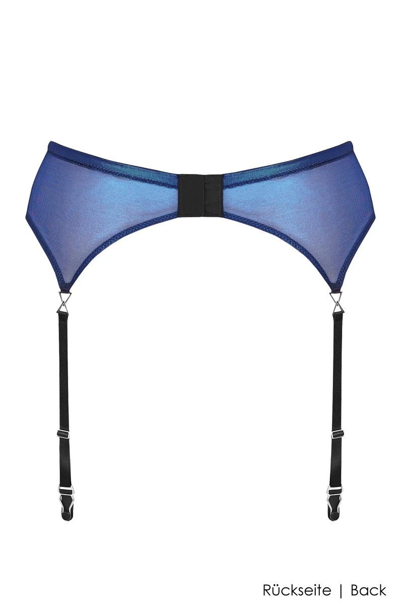 Enjoy the futuristic elegance of this 4-strap Garter belt by Maison Close. The metallic shine of the see through tulle is as unusual as it is sexy. Silver hardware details add to the allure of the design. Wear the Blue Angel Suspender belt with a pair of our exclusive stockings and the matching Blue Angel Lingerie and create a one of a kind lingerie experience.