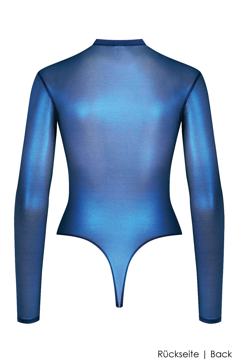 Turn into an intergalactic heroine rocking the Blue Angel longsleeve Thong Body. The metallic blue shine of the see through stretch tulle is absolutely hypnotizing. Experience the unique wearing sensation and use this head turning piece as erotic lingerie as well as the perfect addition to your most fashionable looks.