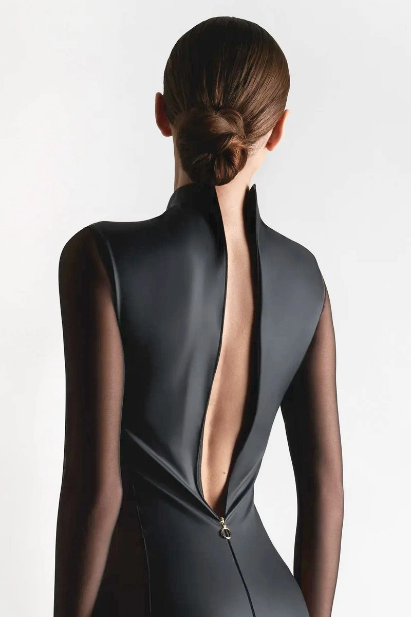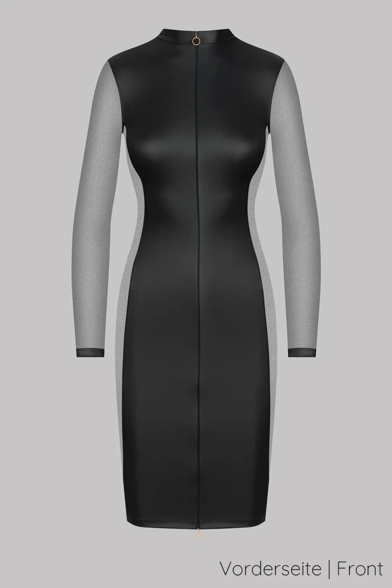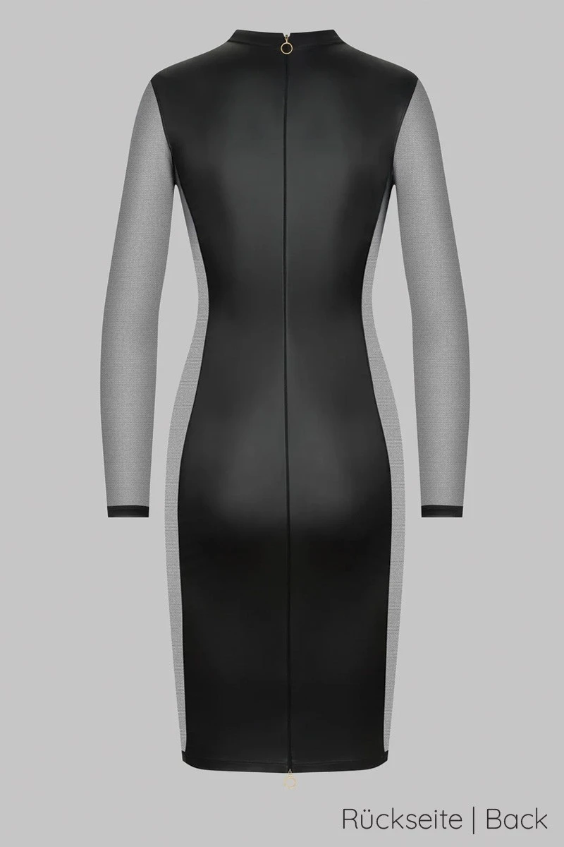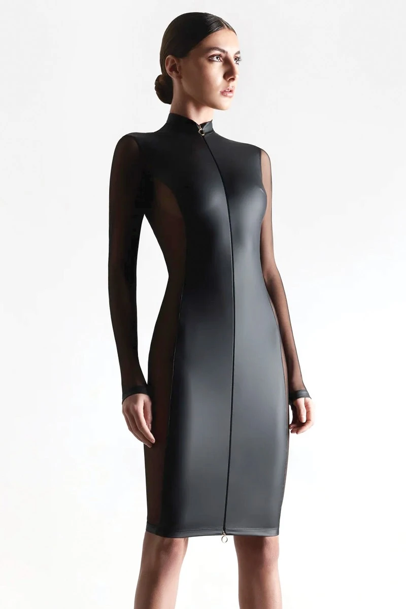 As soon as you slip into this sophisticated BDSM inspired Midi Dress with an elegant stand up collar, you set the mood for the pleasureable things to come. The figure hugging and elegant cut had been achieved by combining high quality wetlook fabric with see-through mesh. And in order for you to easily take your hot date to the next level, the dress is featuring a 2-way golden zipper in the center front AND back!