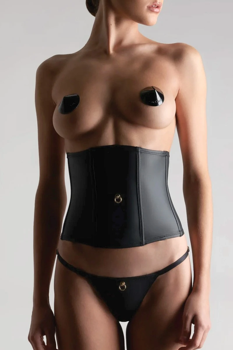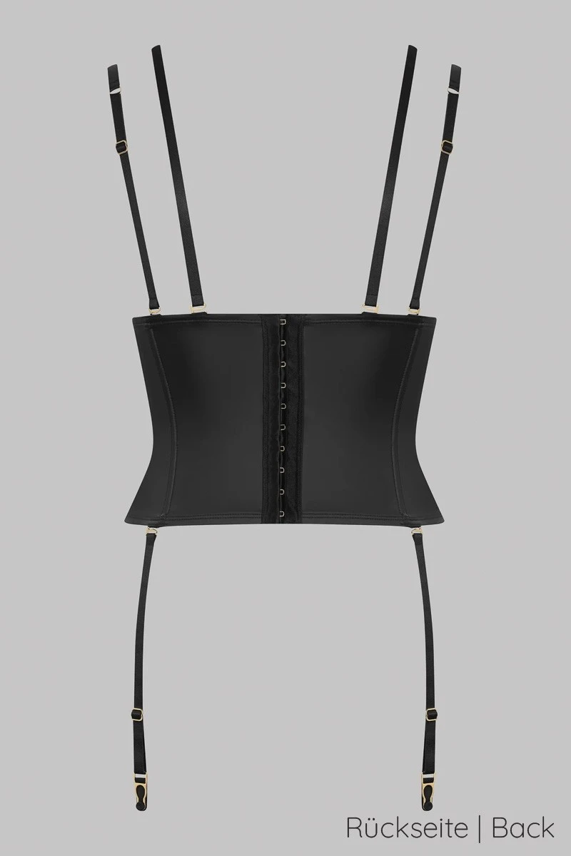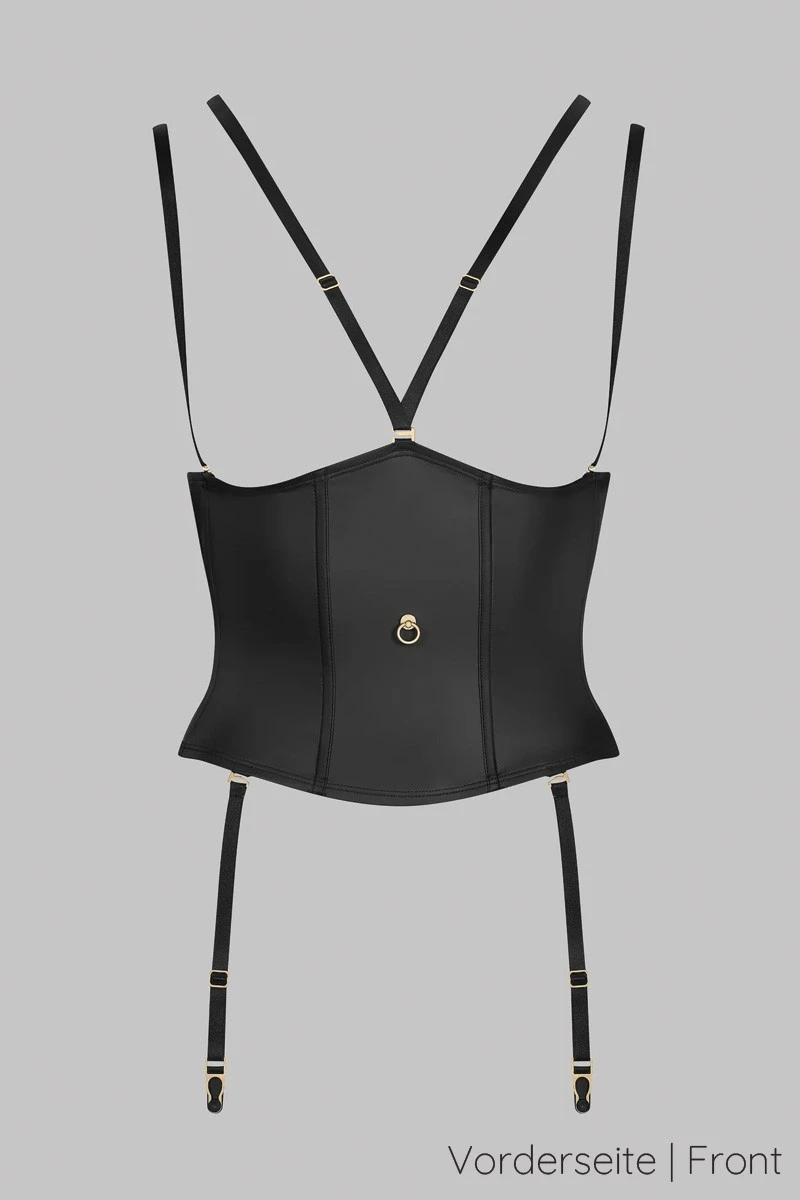 Dressed with or without the detachable shoulder- and suspender straps, this sophisticated wetlook Torselette is inspired by the alluring world of BDSM. A shiny golden O Ring detail is crowning the eye catching lingerie piece in the center front. The various possible combinations with matching bras, bottoms, stockings and accessories provide you with seemingly unlimited ways of celebrating your beauty.