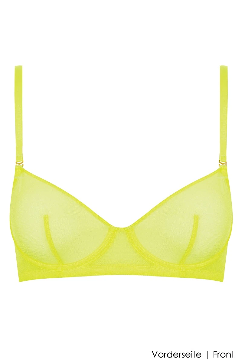 This one of a kind Balcony Bra in neon yellow is the perfect companion for any occasion. Made of stretchy see through mesh with integrated wires, it can be worn as comfortable daily wear or as eye catching lingerie in a more private setting. Don’t forget to chose your favorite bottoms from the Corps a Corps Neon line and feel free to mix all the available neon colours. You can also exchange the fully detachable shoulder straps inbetween the different coloured bras for a special effect. Be creative and put together a truly eye popping lingerie set that you and your partner will love!