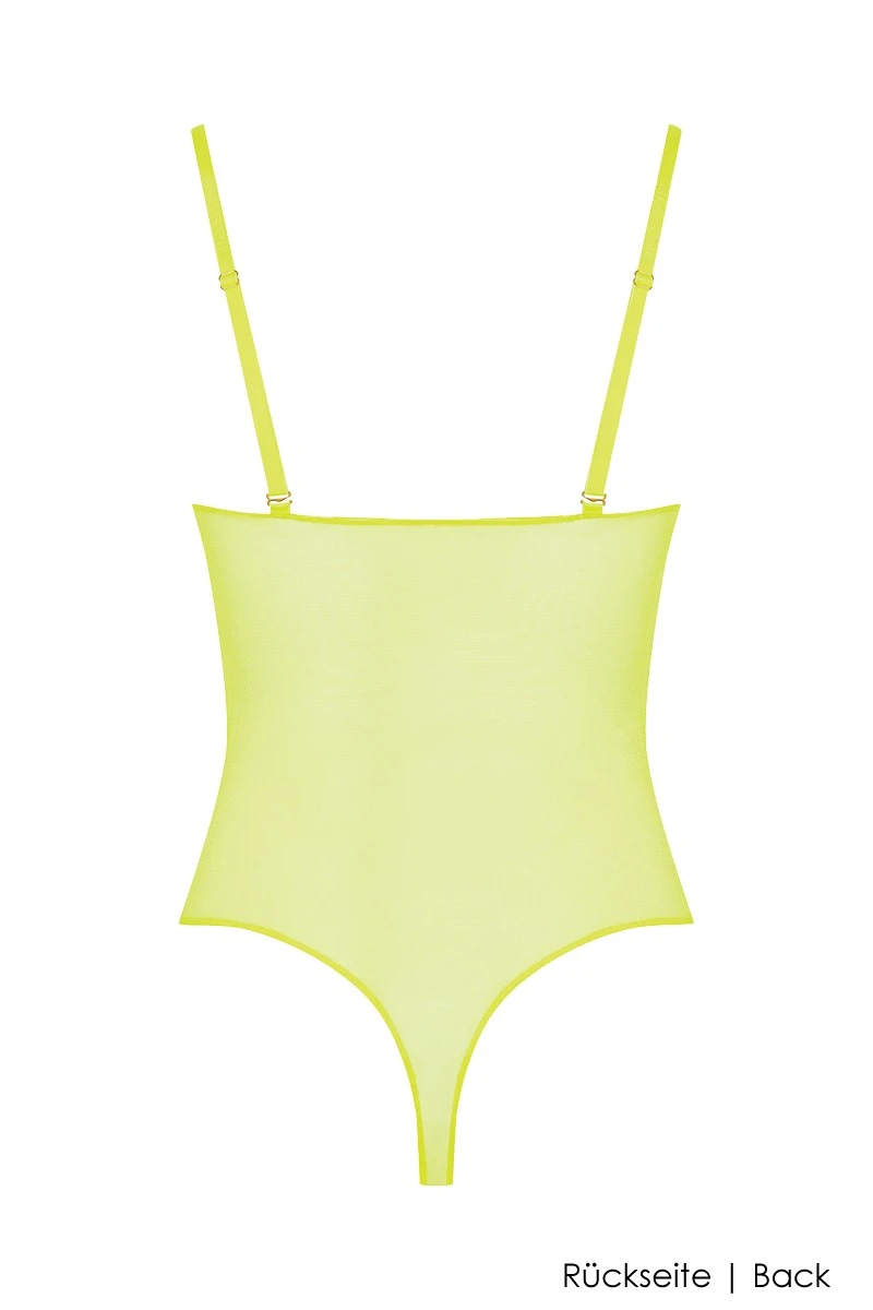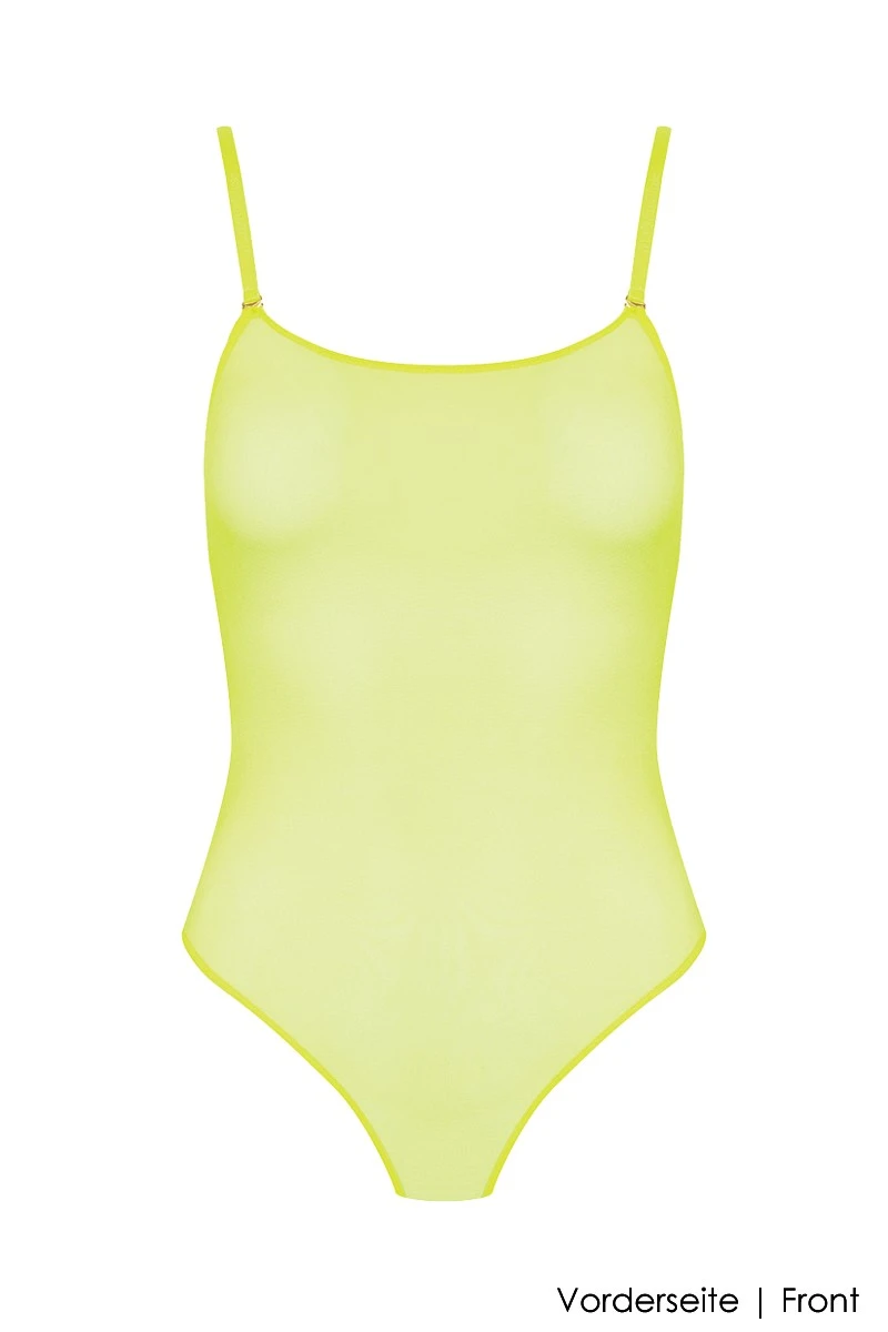 Look radiant and sexy wearing this dazzling neon yellow Thong Body. Made of breathable sheer mesh, it serves you as a body hugging fashion piece as well as an erotic lingerie stunner. The practical opening/closure in between the legs is just perfect for an easy handling as well as for you to enjoy the pleasure of spontaneous love play. Have fun to explore our range of matching neon lingerie pieces and create daring new looks by combining different coloured pieces as you please. For even more fun when styling yourself up, the detachable shoulderstraps can be easily exchanged using the straps of your other bras and bodies.
