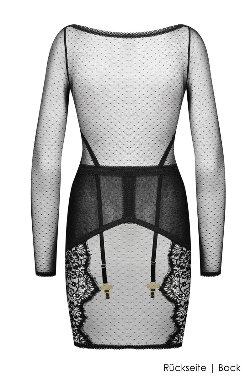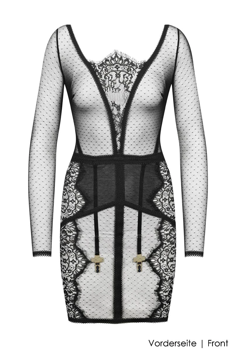 Sexy transparent all around, the „Inpspiration Divine“ Party Dress is made of finest lace and dotted microtulle creating a ravishing look! Adding further glamour to the Dress, detachable strap holders with golden crosses are shining through the fabric of the dress. In combination with a pair of our thigh high stockings, tentalizing Nipple Pasties and High Heels, you will look absolutely „innocent“ and irresistible!