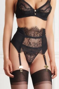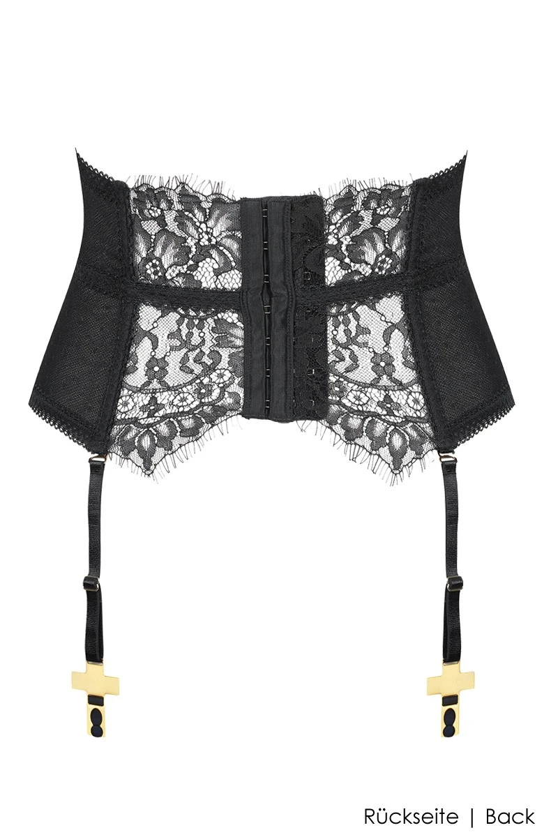 Matching to the Inspiration Divine lingerie, this extraordinary 4-strap garter belt is taking your boudoir look to the next level. Thanks to the detachable strap holders that had been adorned with shiny golden crosses, be assured that your thigh highs will always stay perfectly in place … no matter how heated the moment might become! Once you remove the straps, you can dress your new boudoir favorite as a gorgeous waist belt that highlights your hour glass silhouette. Finest „eyelash“ lace and high quality tulle add to the allure of the dazzling design. Be inspired and check out the „Complete the Look“ slider above for the perfectly matching lingerie and hosiery. The sky is the limit!